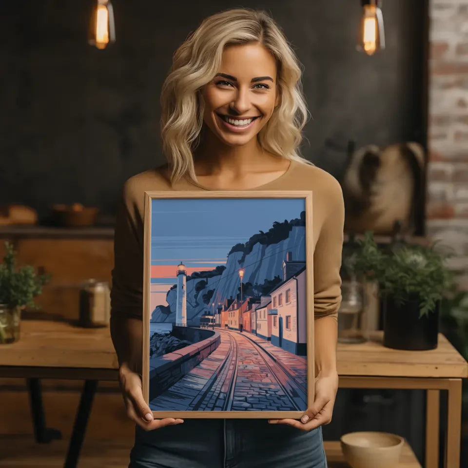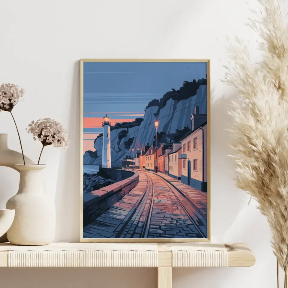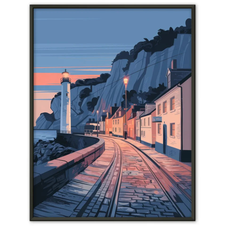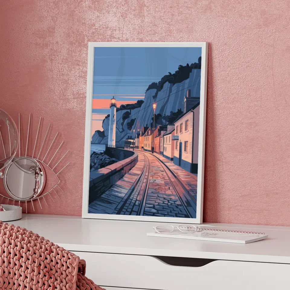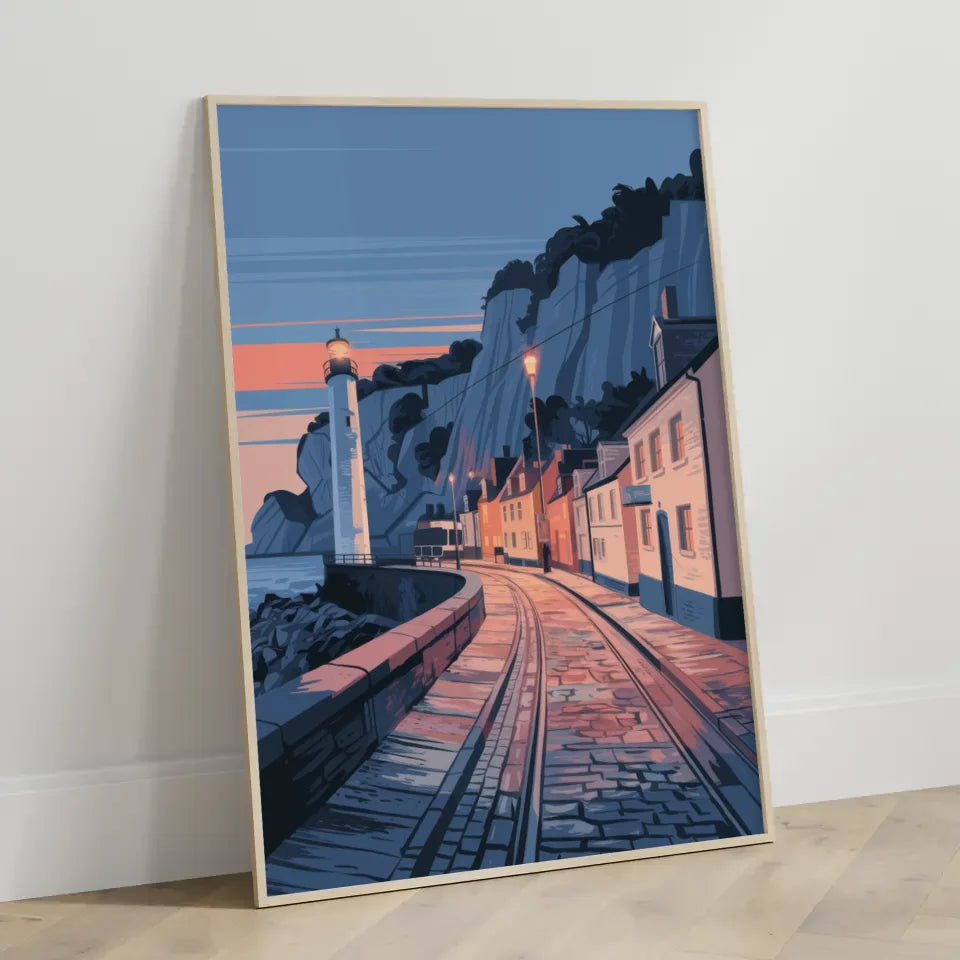 Das Poster bringt Schlüsselelemente wie den imposanten Leuchtturm, die romantische Straße und einen Hauch einer Straßenbahn in den Fokus, die das nostalgische Gefühl der Küstenstadt verstärken. Die minimalistische Farbpalette und die abstrakten Formen schaffen eine harmonische Verbindung zu den subtilen Texturen, die für den Abend typisch sind. Lassen Sie sich von der dynamischen Pinselführung und dem Sinn für Staunen verzaubern, die den Stil van Goghs verkörpern.