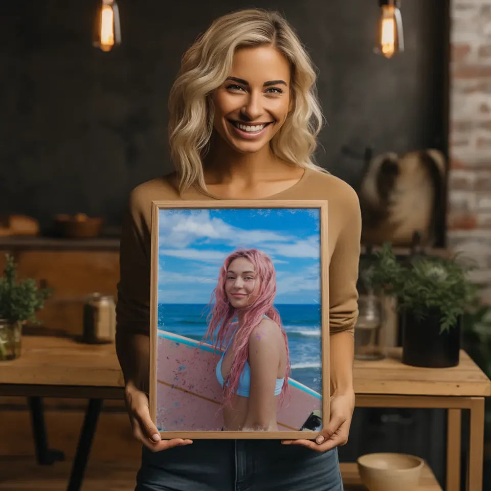 Verleihen Sie Ihrem Raum eine lebendige Atmosphäre mit unserem einzigartigen Poster einer sonnigen Frau mit rosa Haaren und Surfbrett im Meer. Dieses atemberaubende Bild zeigt eine junge Frau mit langen, welligen, rosa Haaren, die selbstbewusst und sanft in die Kamera lächelt. Das Poster ist nicht nur ein echter Blickfang, sondern vermittelt auch ein Gefühl von Freiheit und Abenteuer.
