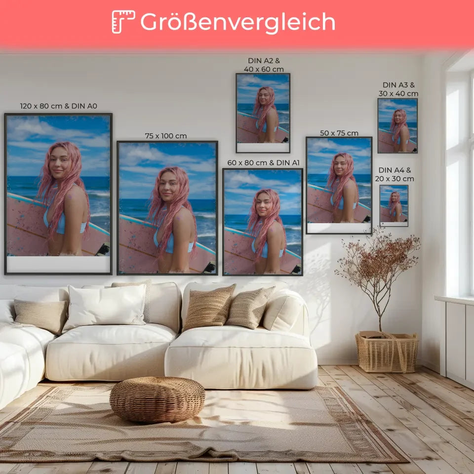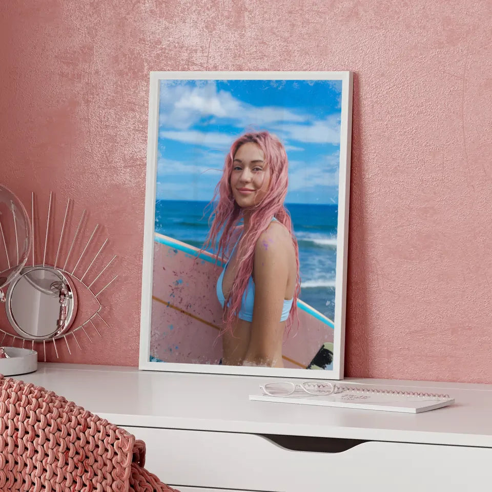 Gestalten Sie Ihr Zuhause mit diesem einzigartigen Poster, das nicht nur als Wanddekoration dient, sondern auch Erinnerungen an Sonne, Strand und Abenteuer weckt. Holen Sie sich noch heute das Poster einer sonnigen Frau mit rosa Haaren und Surfbrett im Meer und setzen Sie farbige Akzente in Ihrer Einrichtung!