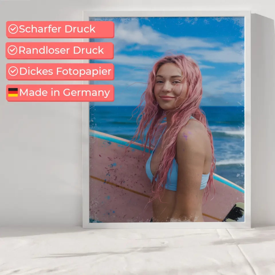 Das gesamte Bild ist in leuchtenden Farben gehalten und strahlt eine dynamische, frische Ausstrahlung aus. Der Grunge- und Distressed-Look verleiht dem Poster zudem einen modernen Touch, der ideal zu individuellen Wohnstilen passt. Egal, ob im Wohnzimmer, im Schlafzimmer oder im Büro – das Poster einer sonnigen Frau mit rosa Haaren und Surfbrett im Meer bringt Lebensfreude und ein wenig Urlaubsgefühl in jeden Raum.