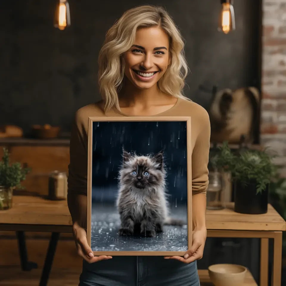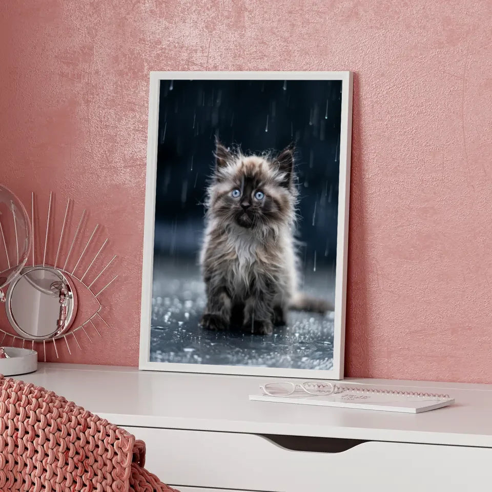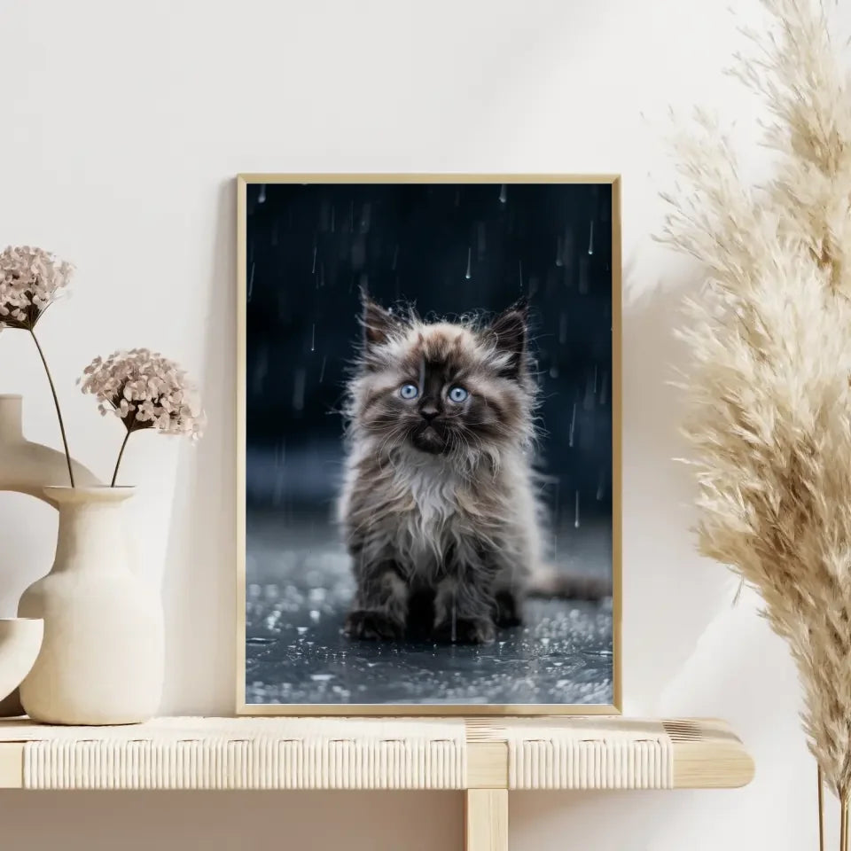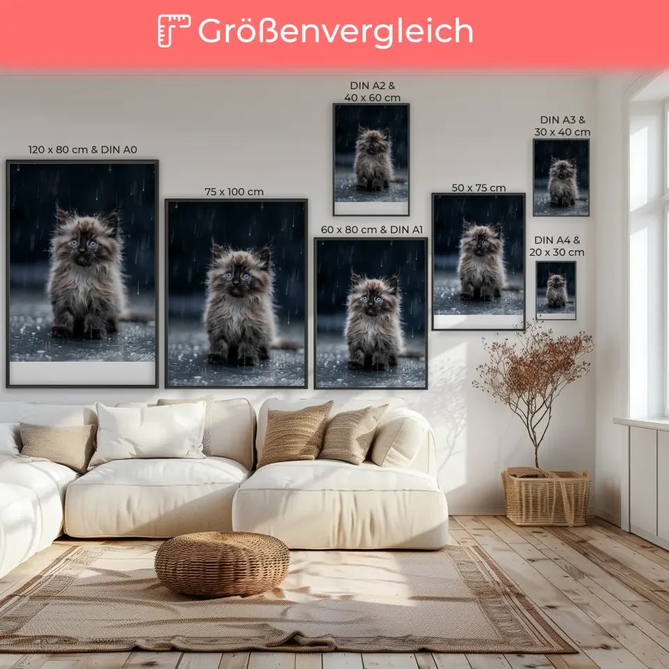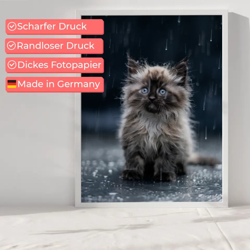 Entdecken Sie unser bezauberndes Poster eines süßen Kätzchens im Nieselregen mit blauen Augen, das jedem Raum eine besondere Note verleiht. Dieses hochwertige Poster zeigt ein kleines, flauschiges Kätzchen, das mit seinem auffälligen Ausdruck und den strahlend blauen Augen sofort Ihre Aufmerksamkeit auf sich zieht. Die leicht fallenden Regentropfen um das Kätzchen schaffen eine stimmungsvolle Atmosphäre, die Emotionen weckt und Geschichten erzählt. Das feuchte Fell des Kätzchens sowie der dunkle Hintergrund heben das Tier perfekt hervor und machen das Poster zu einem echten Blickfang. Ideal für Tierliebhaber oder als Geschenk für Freunde und Familie, bringt dieses Poster Leben in jedes Zuhause. Durch die hochwertige Drucktechnik erhalten Sie ein langlebiges Kunstwerk, das sowohl an der Wand als auch auf dem Tisch zur Geltung kommt. Verwandeln Sie Ihre Räume mit diesem charmanten Poster in einen Ort der Wärme und Geborgenheit!