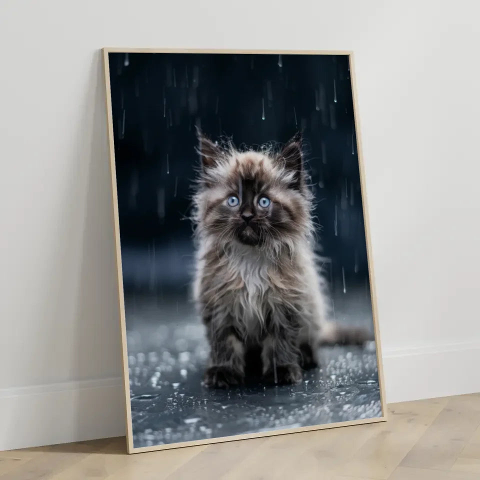 Poster eines süßen Kätzchens im Nieselregen mit blauen Augen