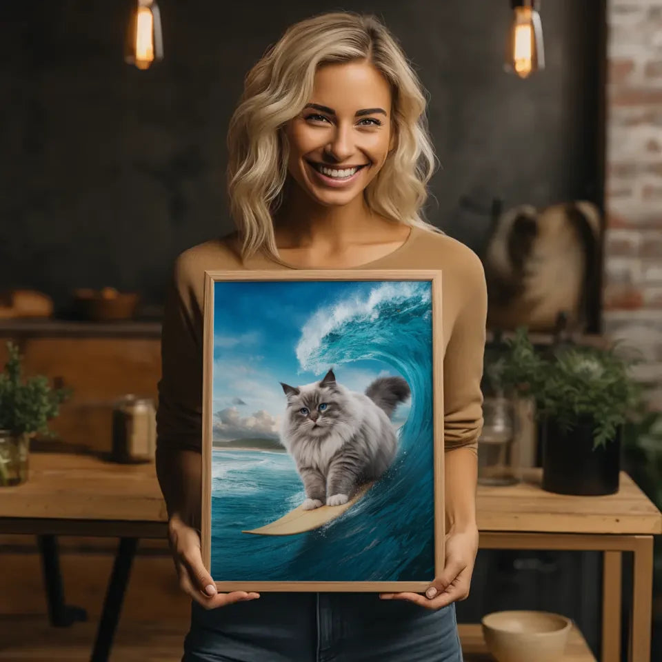Unser Poster flauschige Katze beim Surfen auf Wellen im azurblauen Himmel ist nicht nur ein tolles Deko-Element, sondern auch ein ideales Geschenk für Freunde und Familie. Verleihen Sie Ihrem Zuhause mit diesem bezaubernden Tiermotiv eine persönliche Note. Warten Sie nicht länger und bringen Sie mit diesem Poster Freude und Lebendigkeit in Ihre vier Wände!
