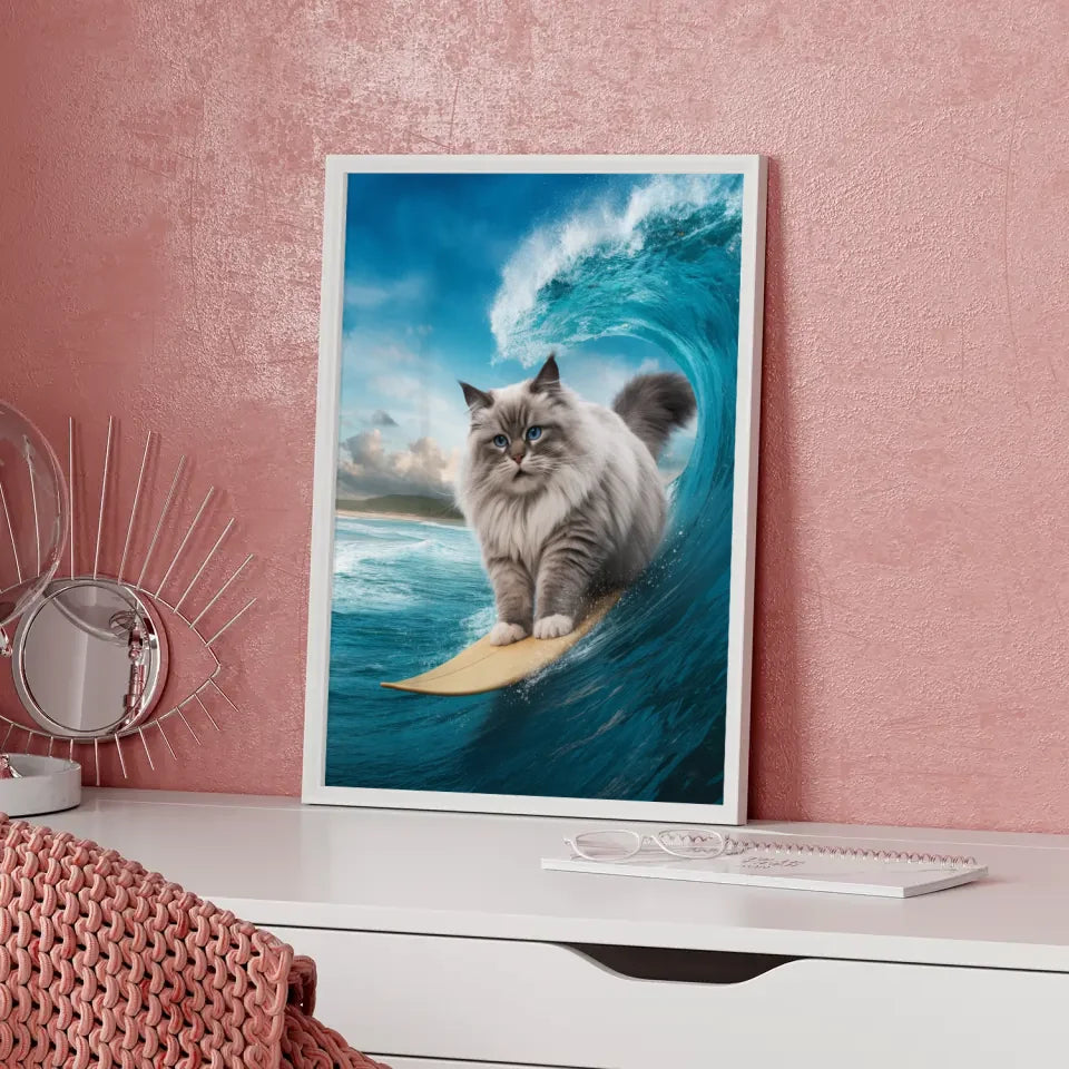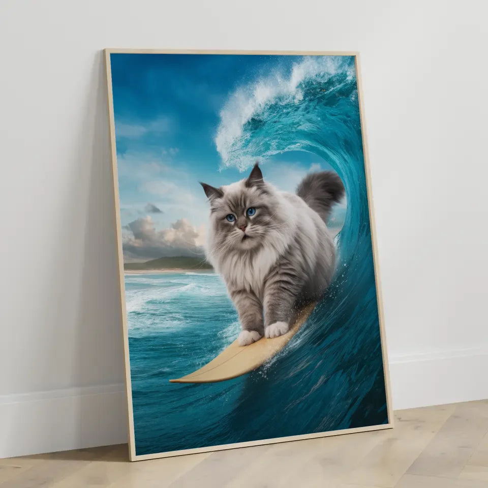 Entdecken Sie unser einzigartiges Poster flauschige Katze beim Surfen auf Wellen im azurblauen Himmel, das nicht nur Tierliebhaber begeistert, sondern auch Ihrem Raum eine lebendige Note verleiht. Dieses beeindruckende Wandbild zeigt eine große, flauschige Katze, die mühelos auf einer kräuselnden Meereswelle surft. Die auffälligen blauen Augen der Katze sind voller Schalk und Aufregung und stehen in perfektem Kontrast zu ihrem weichen, weißen Fell. Der spielerische Ausdruck der Katze wird durch ihre nach hinten gelegten Ohren unterstrichen, während sie mit Leichtigkeit auf der Welle reitet.