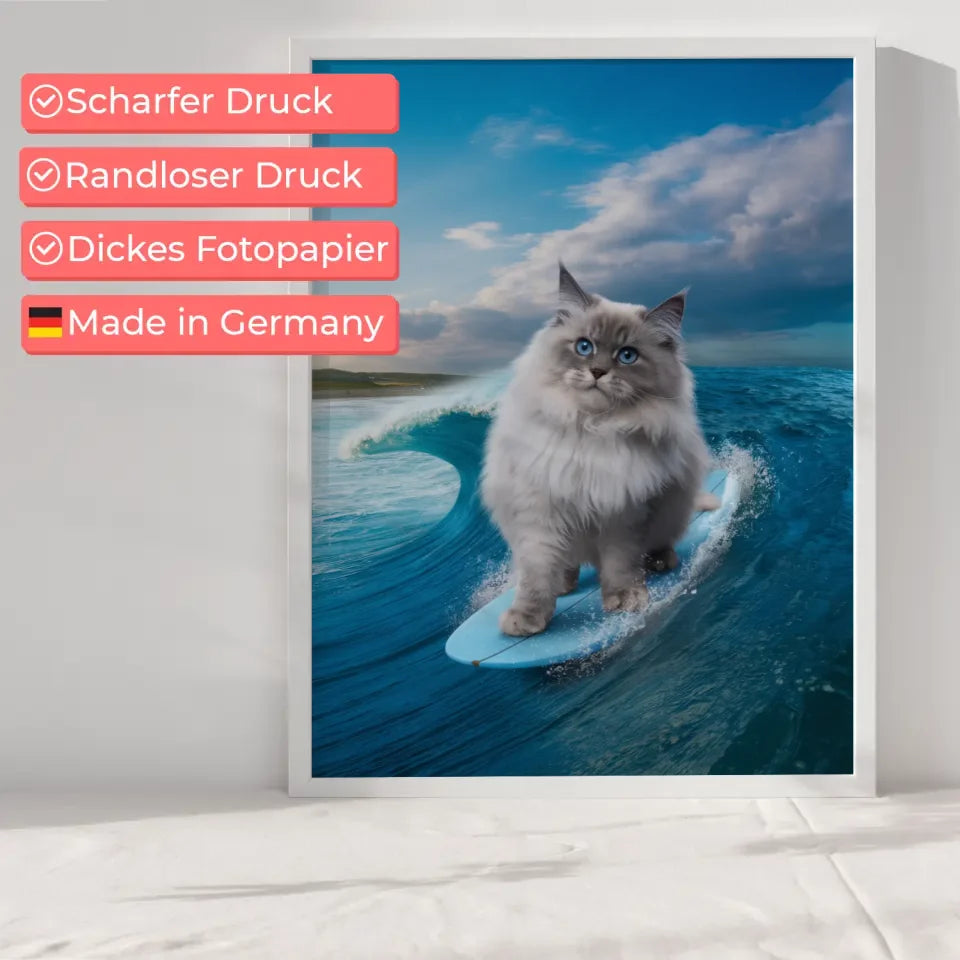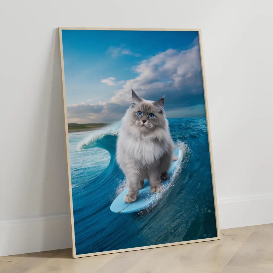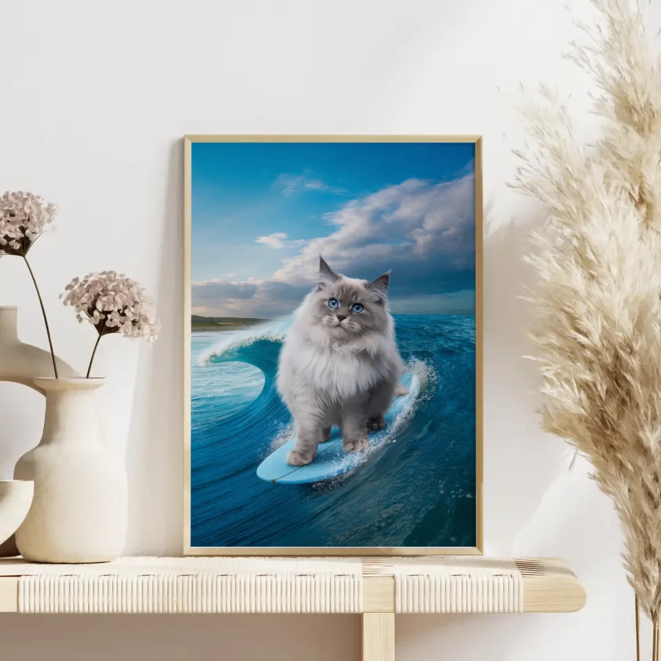 Warten Sie nicht länger – holen Sie sich das Poster flauschige Katze surft auf Welle mit blauem Himmel im Hintergrund und machen Sie Ihr Zuhause zu einem Ort voller Leben und Freude!
