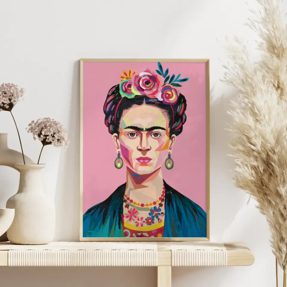Entdecken Sie unser einzigartiges Poster Frida Kahlo mit Blumenkrone, das eine faszinierende abstrakte Illustration der ikonischen mexikanischen Malerin präsentiert. Diese Kunstwerk ist nicht nur ein Blickfang in jedem Raum, sondern bringt auch die Kraft und den Geist einer der bedeutendsten Künstlerinnen der Geschichte zum Ausdruck. Das Poster zeigt Frida Kahlo mit ihrer bunten Blumenkrone und Blumenkette, die symbolisch für die Stärke und Leidenschaft der Frau stehen.