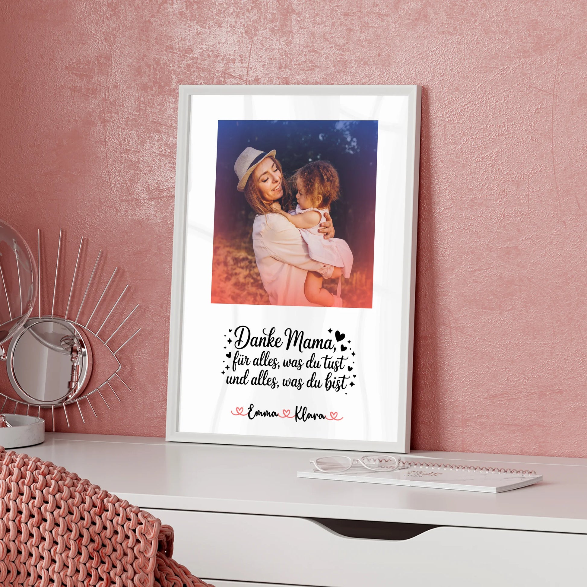 Personalisiertes Fotoposter für deine Mama zum Muttertag: Gestalte ein emotionales und individuelles Geschenk mit 1 Foto, eigenem Namen, Wunschtext und wählbarem Hintergrund. Das Design trägt den schönen Spruch Danke Mama, für alles, was du tust und alles, was du bist und du kannst diesen Spruch beibehalten oder durch einen eigenen Wunschtext ersetzen. Perfekt, um Erinnerungen zu zeigen und deiner Mama persönlich Danke zu sagen.
