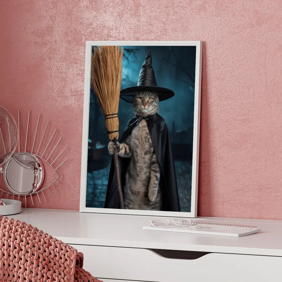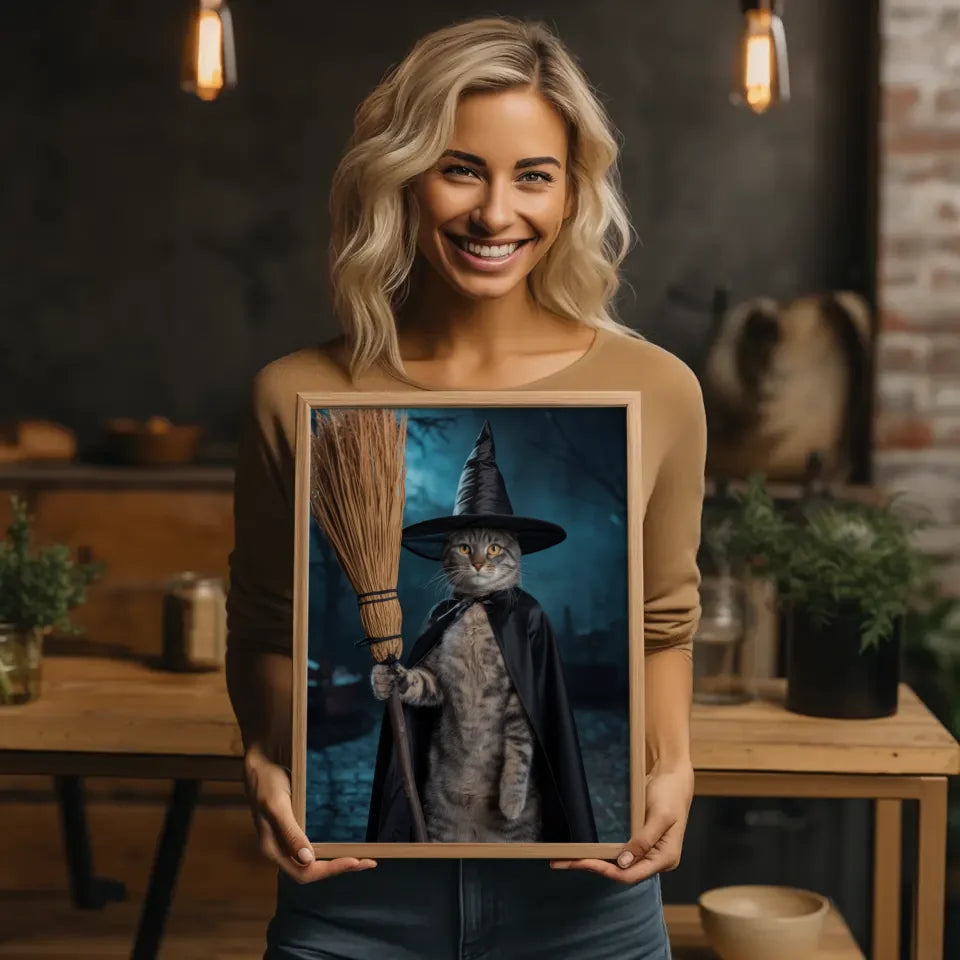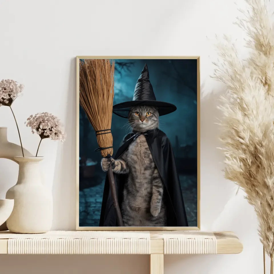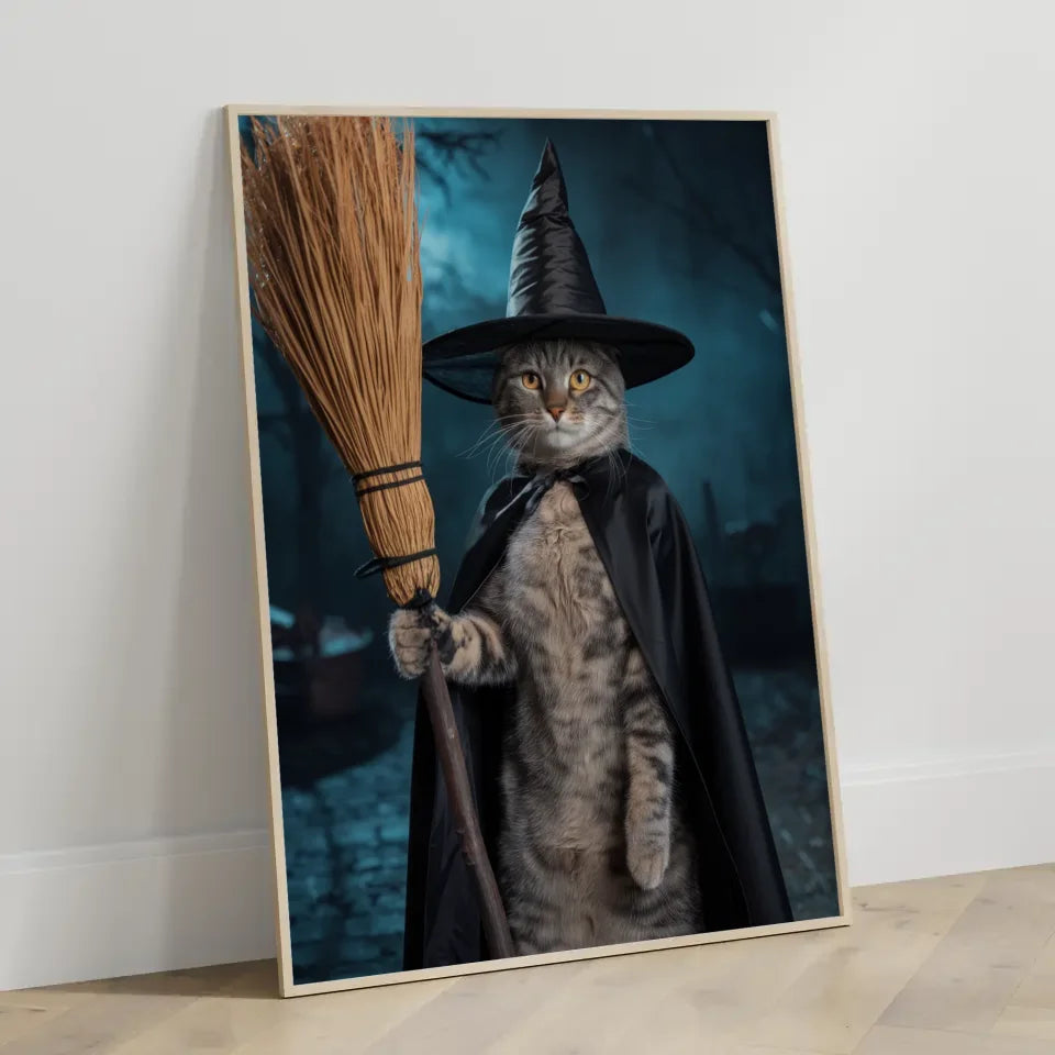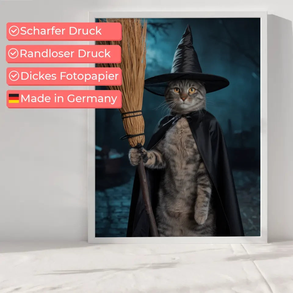 Entdecken Sie unser einzigartiges Poster Hexenkatze mit Menschen Gesicht Hexenkostüm nächtliche Stimmung, das jede Wand in Ihrem Zuhause zu einem faszinierenden Blickfang werden lässt. Dieses außergewöhnliche Kunstwerk zeigt eine Katze mit menschenähnlichen Gesichtszügen, die aufrecht steht und ein klassisches Hexenkostüm trägt. Mit ihrem spitzen schwarzen Hut und dem eleganten Umhang erweckt die Katze sofort das Gefühl von Magie und Geheimnis. Der Besenstiel, den sie in ihren Pfoten hält, verstärkt das mystische Flair dieses Posters. Die düstere, schwach beleuchtete Hintergrundgestaltung verleiht dem Bild eine unheimliche nächtliche Atmosphäre, die perfekt für Halloween oder die Gestaltung Ihrer Wohnräume ist. Unser Poster ist in verschiedenen Größen erhältlich und eignet sich hervorragend als Geschenk für Katzenliebhaber oder als stilvolles Element in Ihrer eigenen Einrichtung. Setzen Sie mit diesem eindrucksvollen Poster Akzente in Ihrem Zuhause und lassen Sie die Hexenkatze mit Menschen Gesicht den Raum verzaubern.