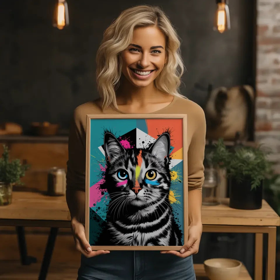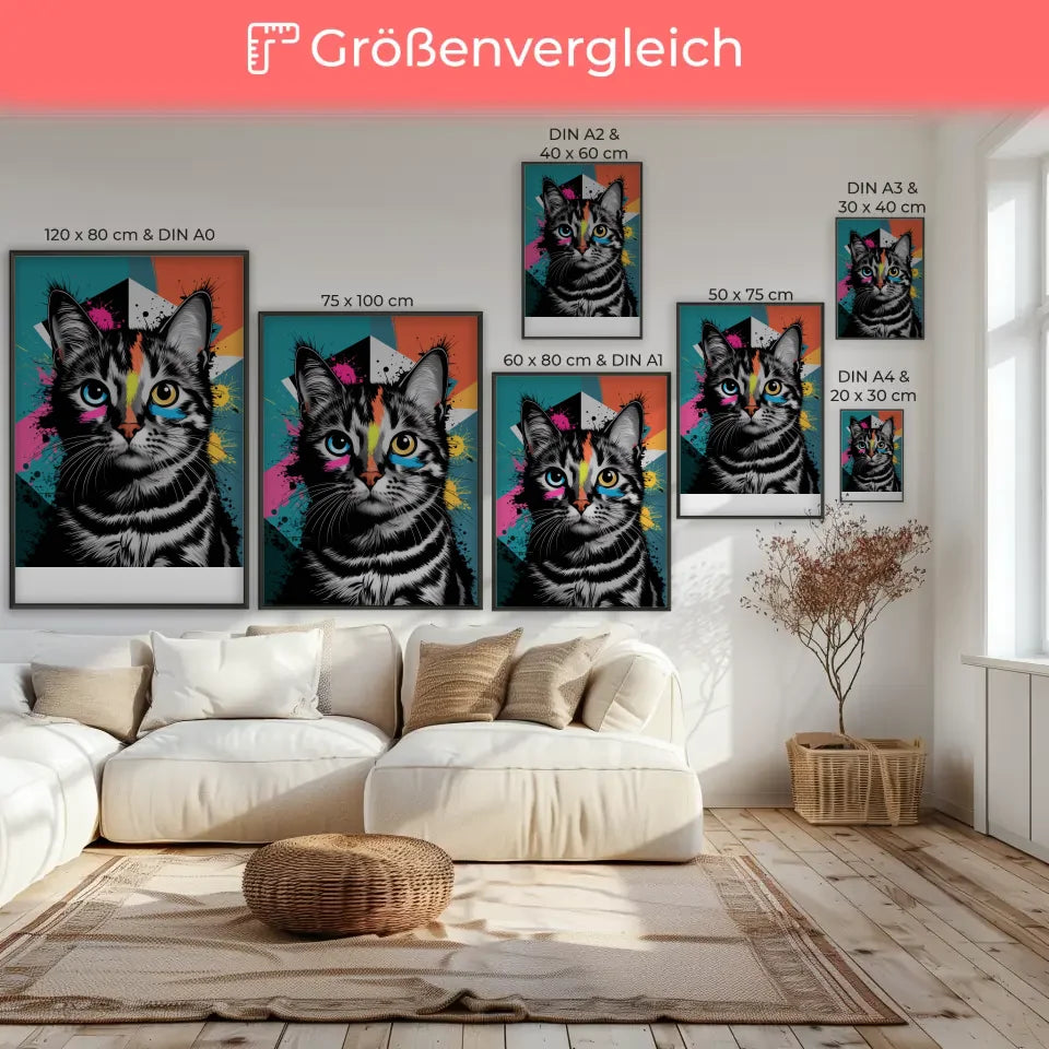 Gestalten Sie Ihre Wände neu und setzen Sie mit dem Poster Katze mit buntem, abstraktem Hintergrund ein Zeichen für Kreativität und Individualität. Ideal geeignet für Wohnzimmer, Schlafzimmer oder kreative Räume, wird dieses Kunstwerk garantiert zu einem Gesprächsthema unter Ihren Gästen.