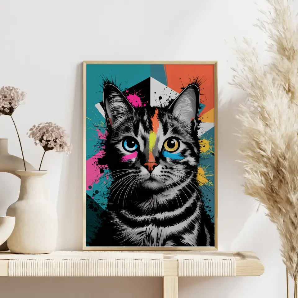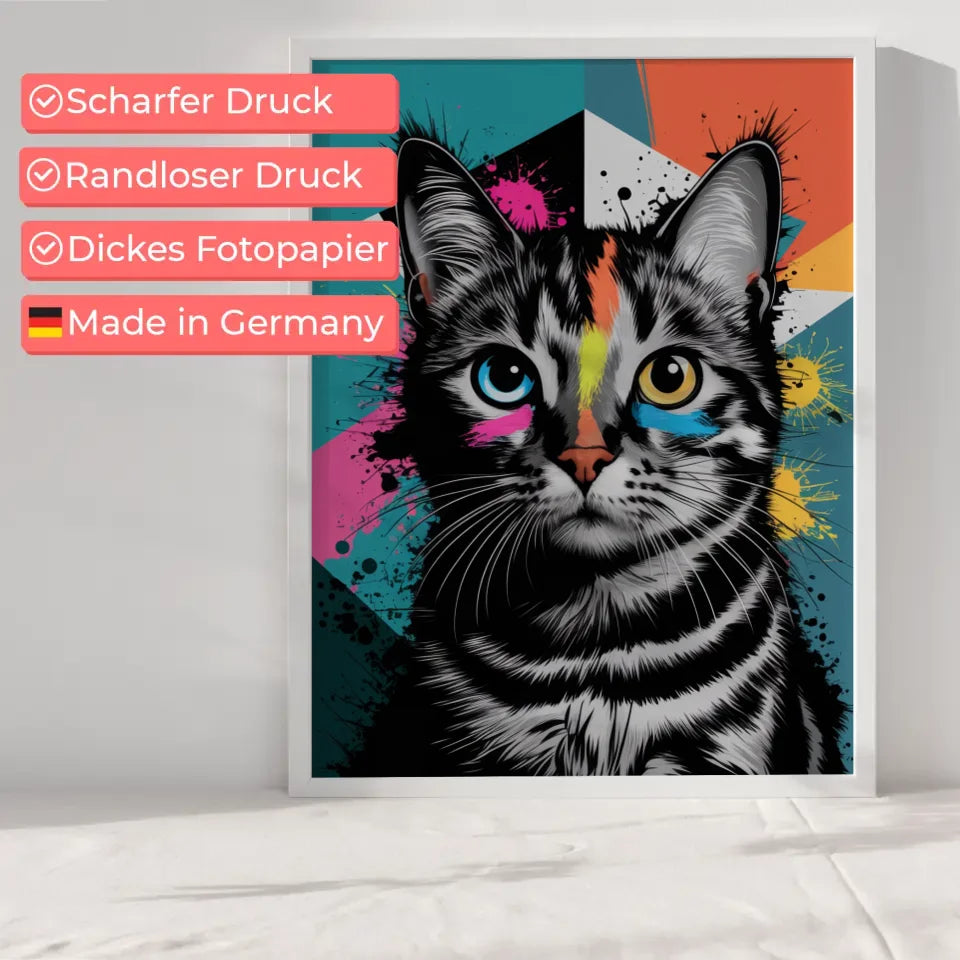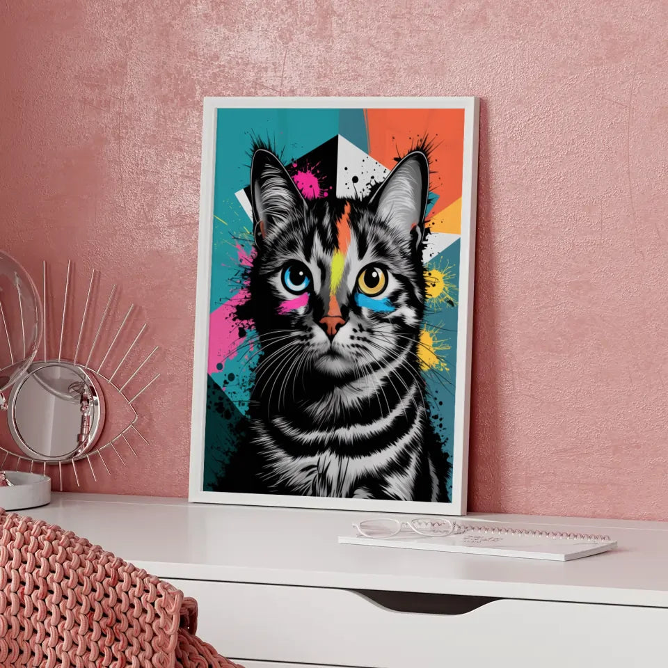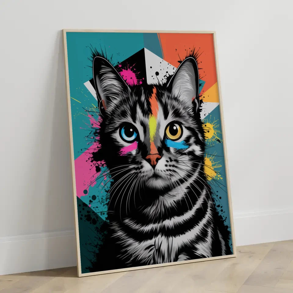 Entdecken Sie das faszinierende Poster Katze mit buntem, abstraktem Hintergrund, das Ihrem Wohnraum einen einzigartigen Akzent verleiht. Dieses kreative Kunstwerk zeigt eine Katze, deren Gesicht durch kräftiges, farbenfrohes Make-up hervorgehoben wird. Die lebendigen Farben in Neonrosa, Blau und Neonorange verschmelzen harmonisch mit einem dynamischen, abstrakten Hintergrund, der aus geometrischen Formen, Pinselstrichen und Farbspritzern besteht.