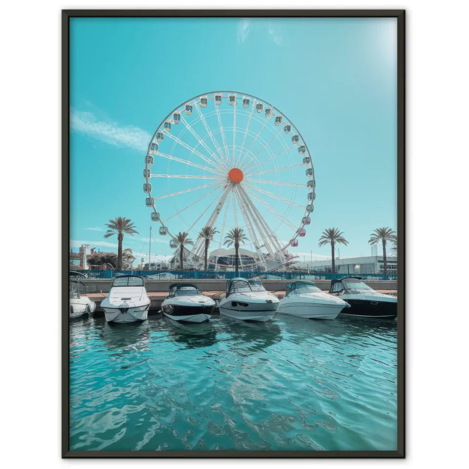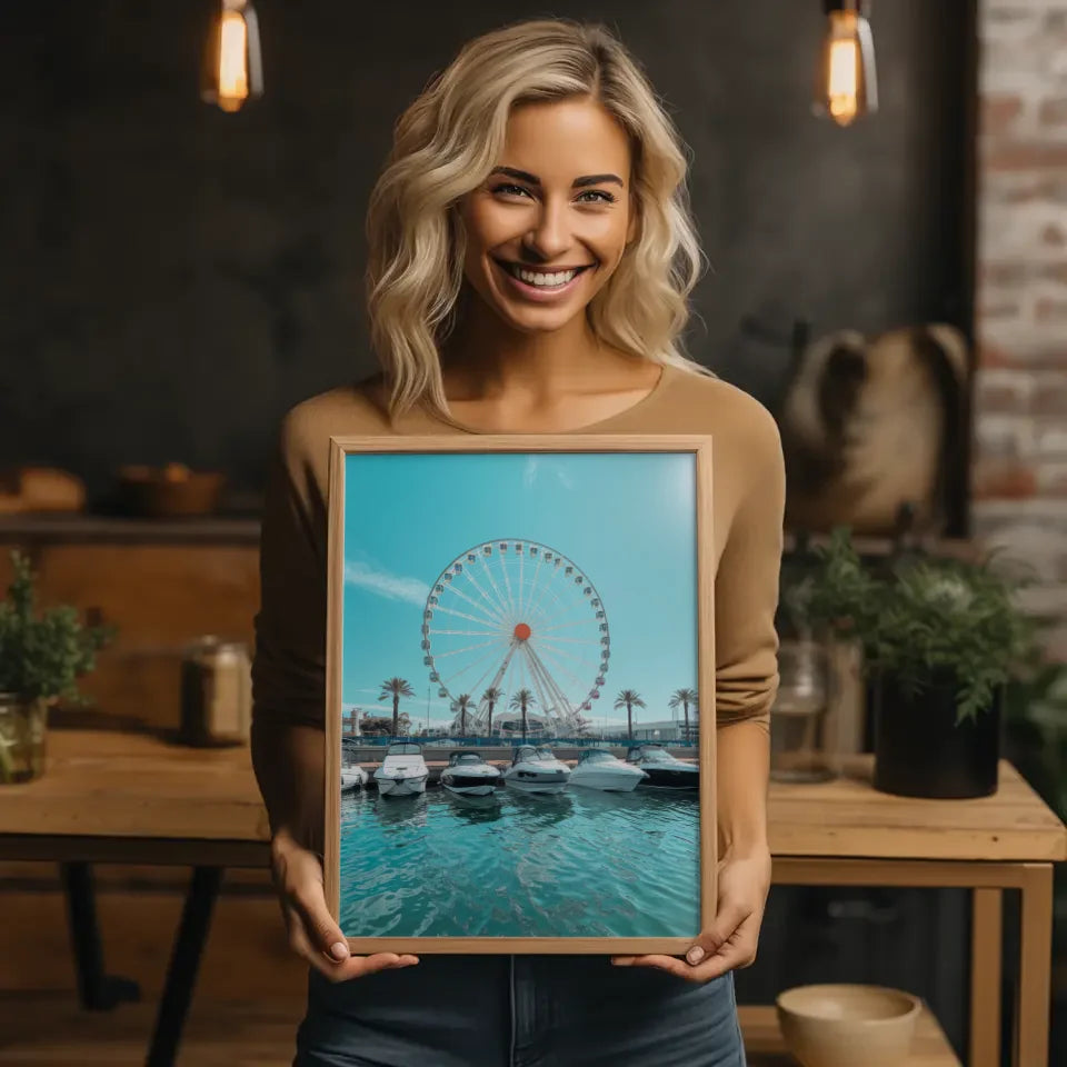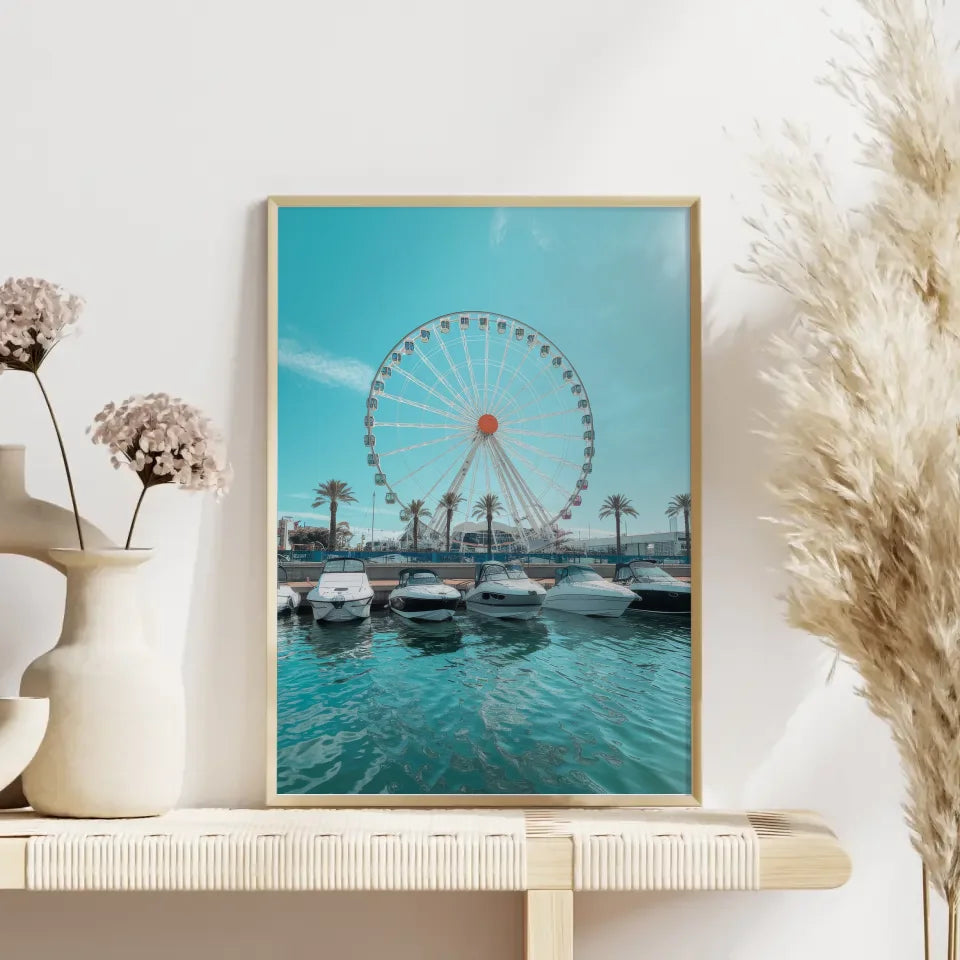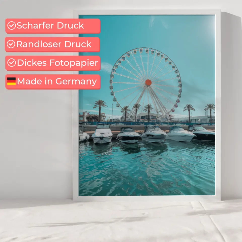 Die Palmen, die die Küstenkulisse umrahmen, verleihen der Szenerie einen tropischen Touch und machen das Poster zu einem perfekten Blickfang. Holen Sie sich mit diesem atemberaubenden Poster Küstenkulisse mit Riesenrad und Palmen ein Stück Urlaub nach Hause. Ideal für jeden Raum, der eine positive Ausstrahlung und einen Hauch von Exotik benötigt. Verschönern Sie Ihr Zuhause mit diesem einzigartigen Poster und genießen Sie die entspannende Atmosphäre, die es verbreitet.