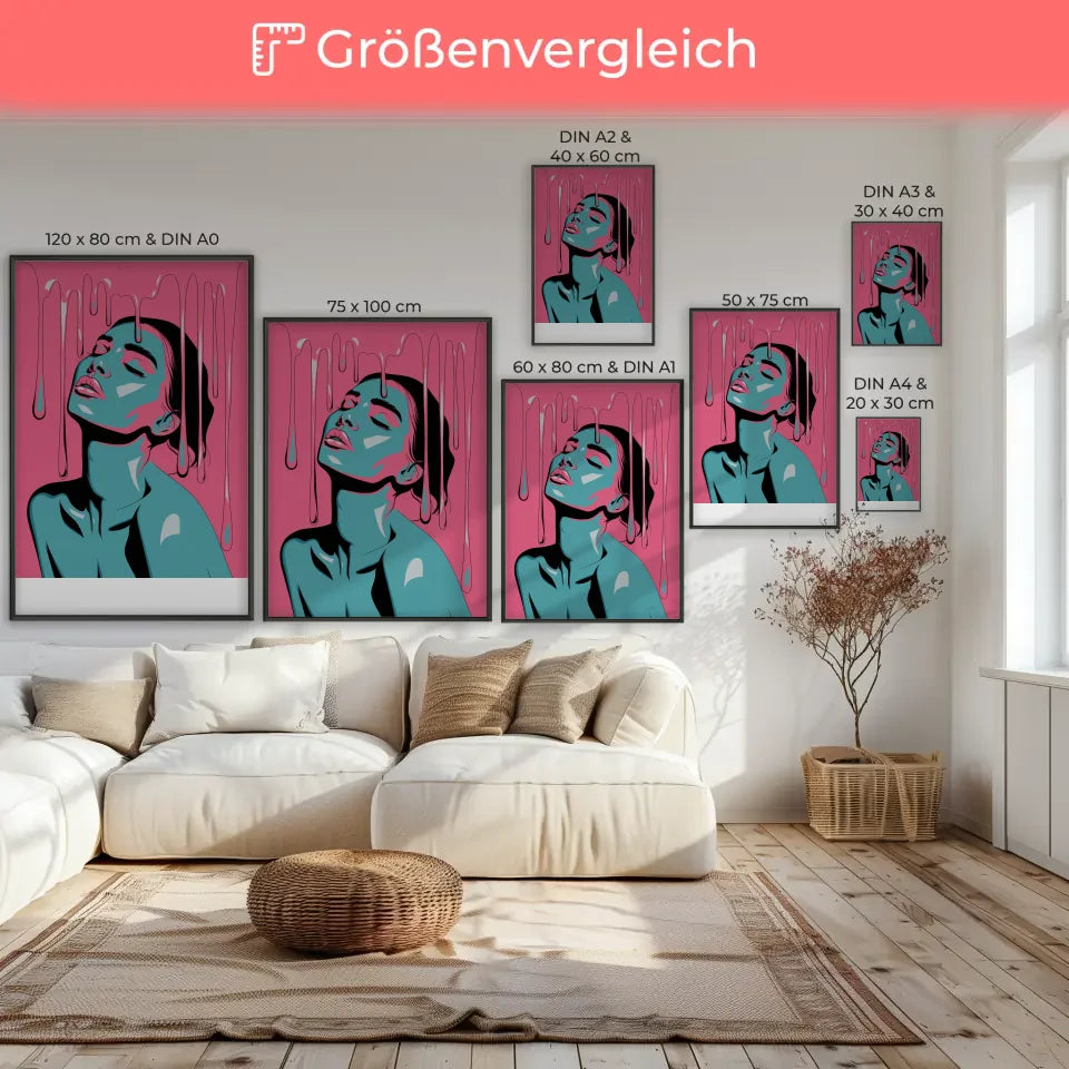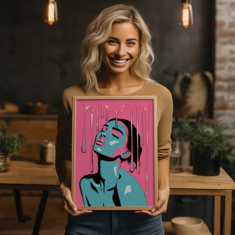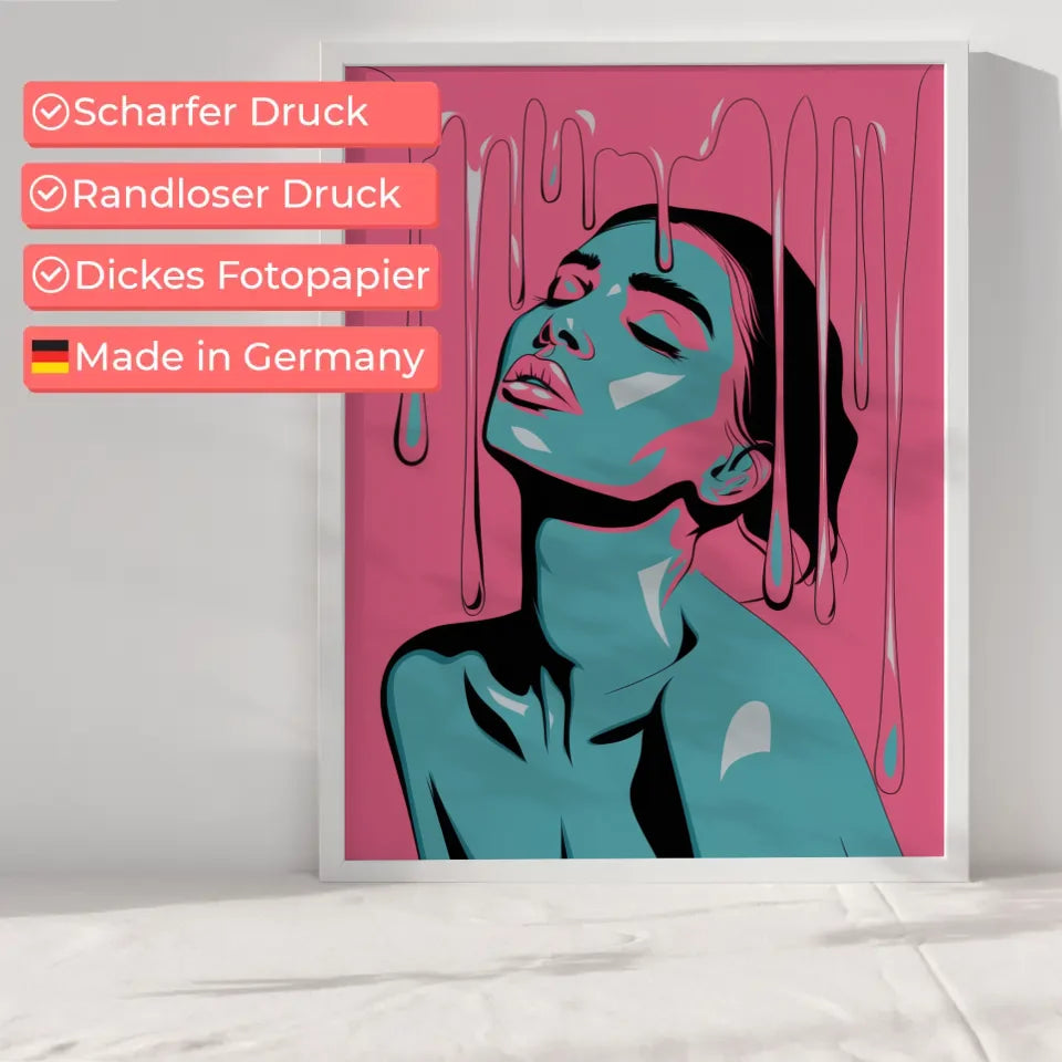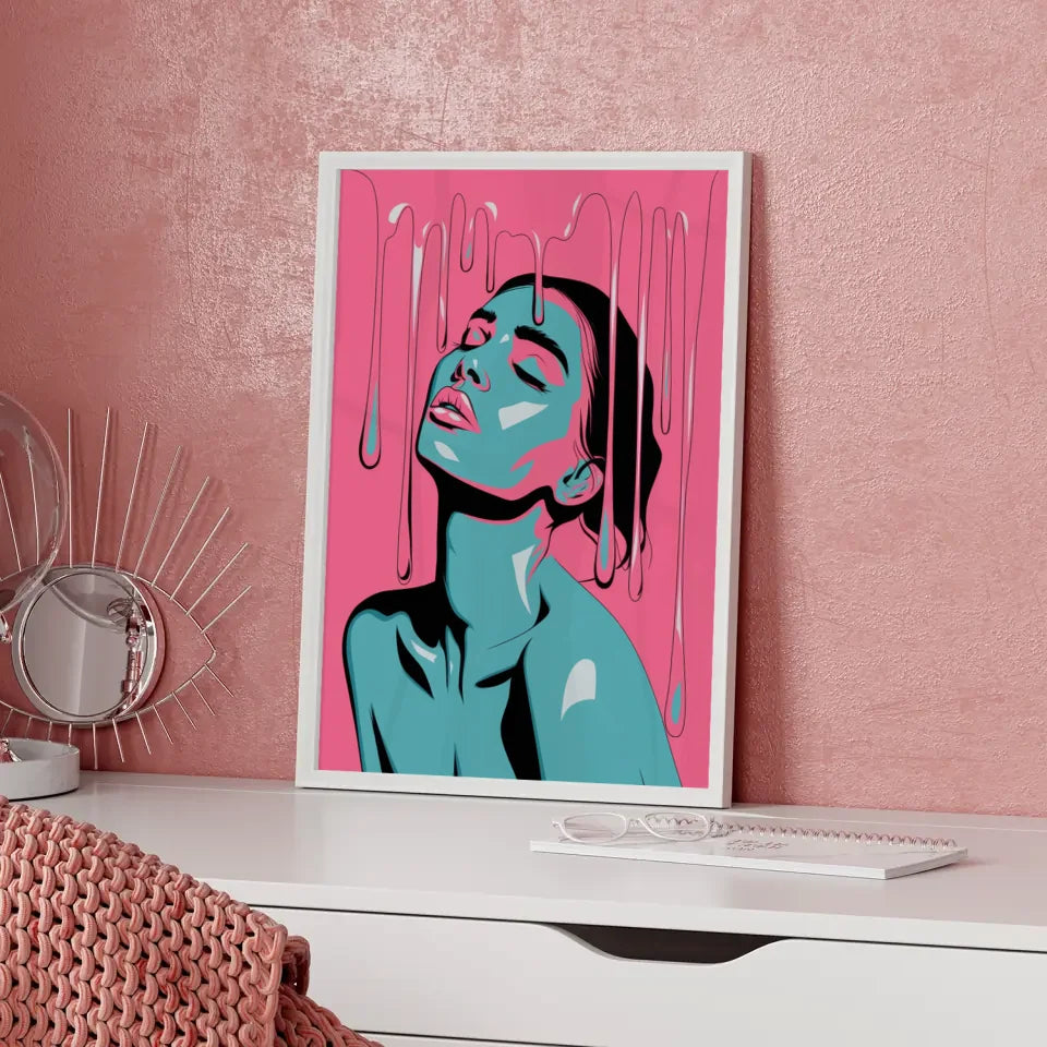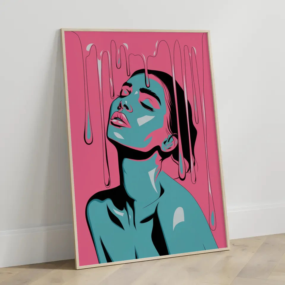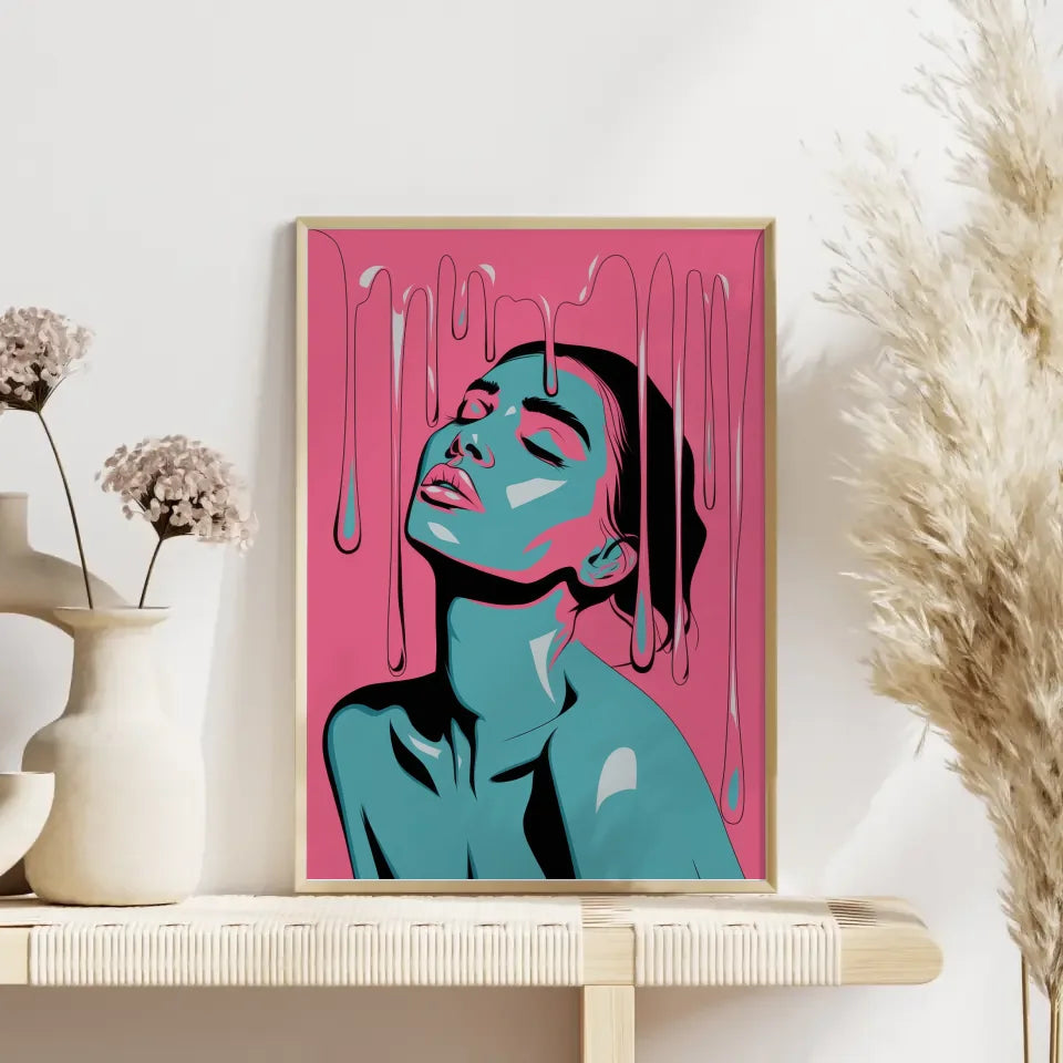 Entdecken Sie das faszinierende Poster leuchtendes PortrĂ€t einer Frau in Rosa, das Ihrer Wand einen einzigartigen Akzent verleiht. Dieses stilisierte Kunstwerk zeigt eine Frau mit geschlossenen Augen, die ihren Kopf sanft nach hinten neigt. Die lebendigen Rosa- und TĂŒrkistöne fangen die Aufmerksamkeit und verleihen jedem Raum eine besondere Note. Die Tropfen, die an schmelzendes Wachs oder Farbe erinnern, fallen sanft von ihrem Kopf und ziehen den Betrachter in ihren Bann.