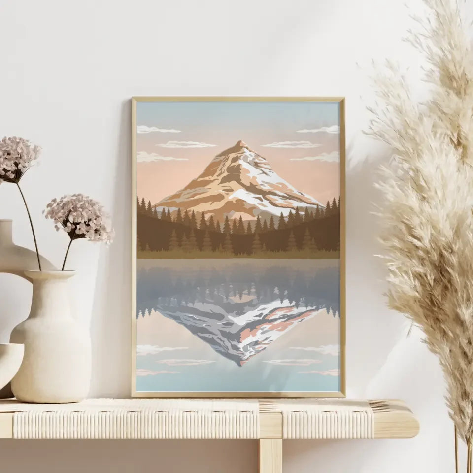 Gestalten Sie Ihr Zuhause mit einem Hauch von Natur und Ruhe, indem Sie das Poster majestĂ€tischer Berglandschaft mit ruhigem Wasser und Wald wĂ€hlen. Ein perfektes Geschenk fĂŒr Naturliebhaber und eine groĂartige ErgĂ€nzung fĂŒr jede Boho-inspirierte Einrichtung.