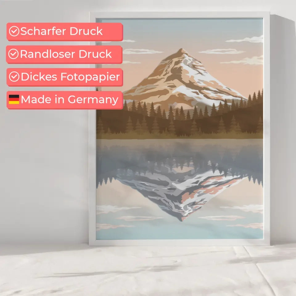 Das Poster fĂ€ngt die Ruhe des Wassers perfekt ein, da es die Landschaft in einem symmetrischen Spiegelbild reflektiert. Die zarten Pfirsich- und Hellblautöne des Himmels verleihen dem Motiv eine romantische Note und lassen es sowohl zur Morgen- als auch zur AbenddĂ€mmerung passen. Ideal fĂŒr Ihr Wohnzimmer, Schlafzimmer oder auch als Blickfang im Flur, dieses Poster wird sicherlich alle Blicke auf sich ziehen.