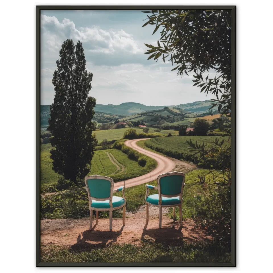 Poster malerische Landschaft mit Vintage Stühlen und Hügeln