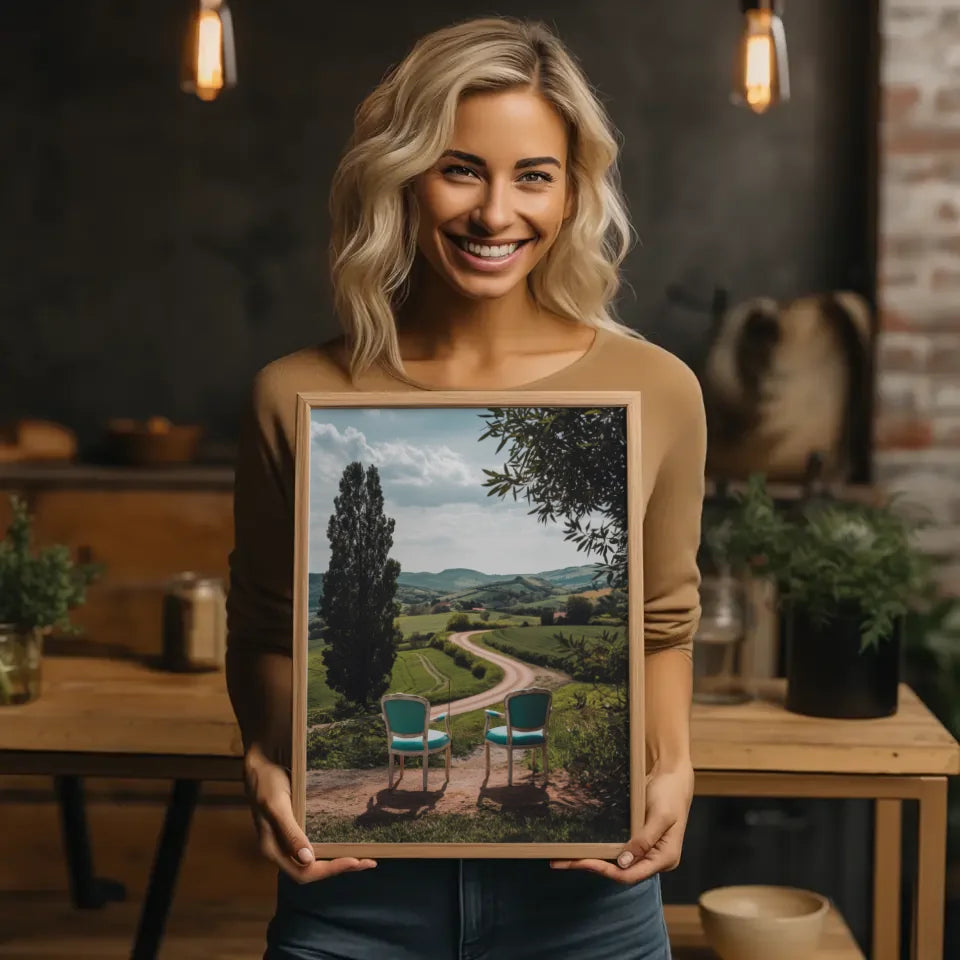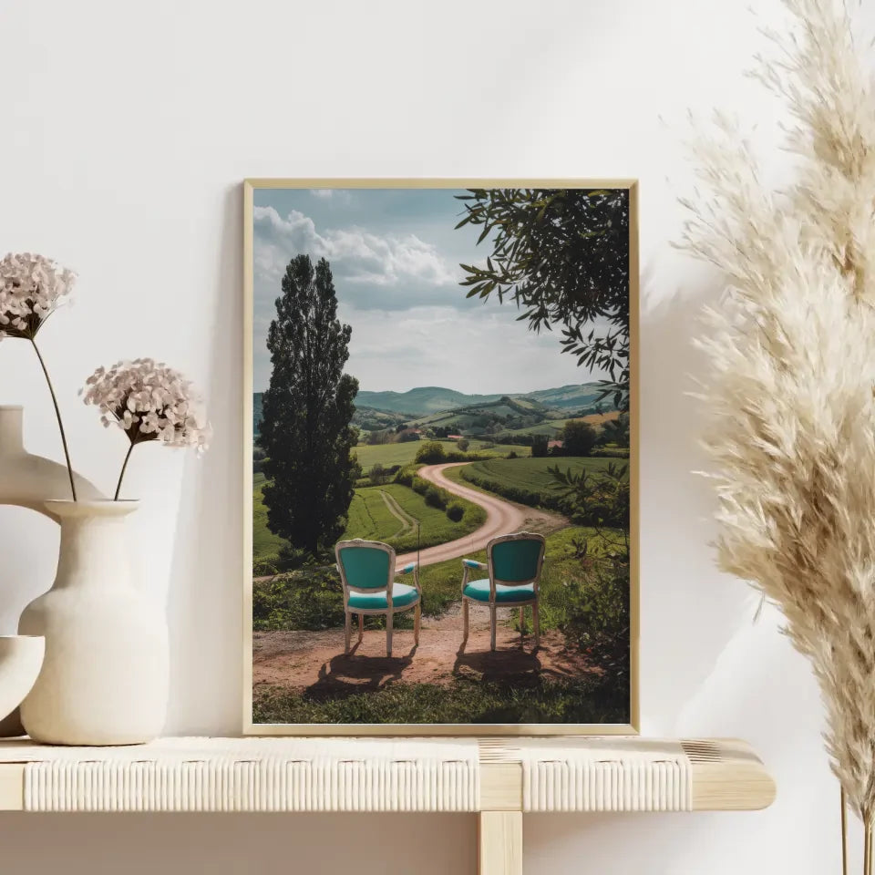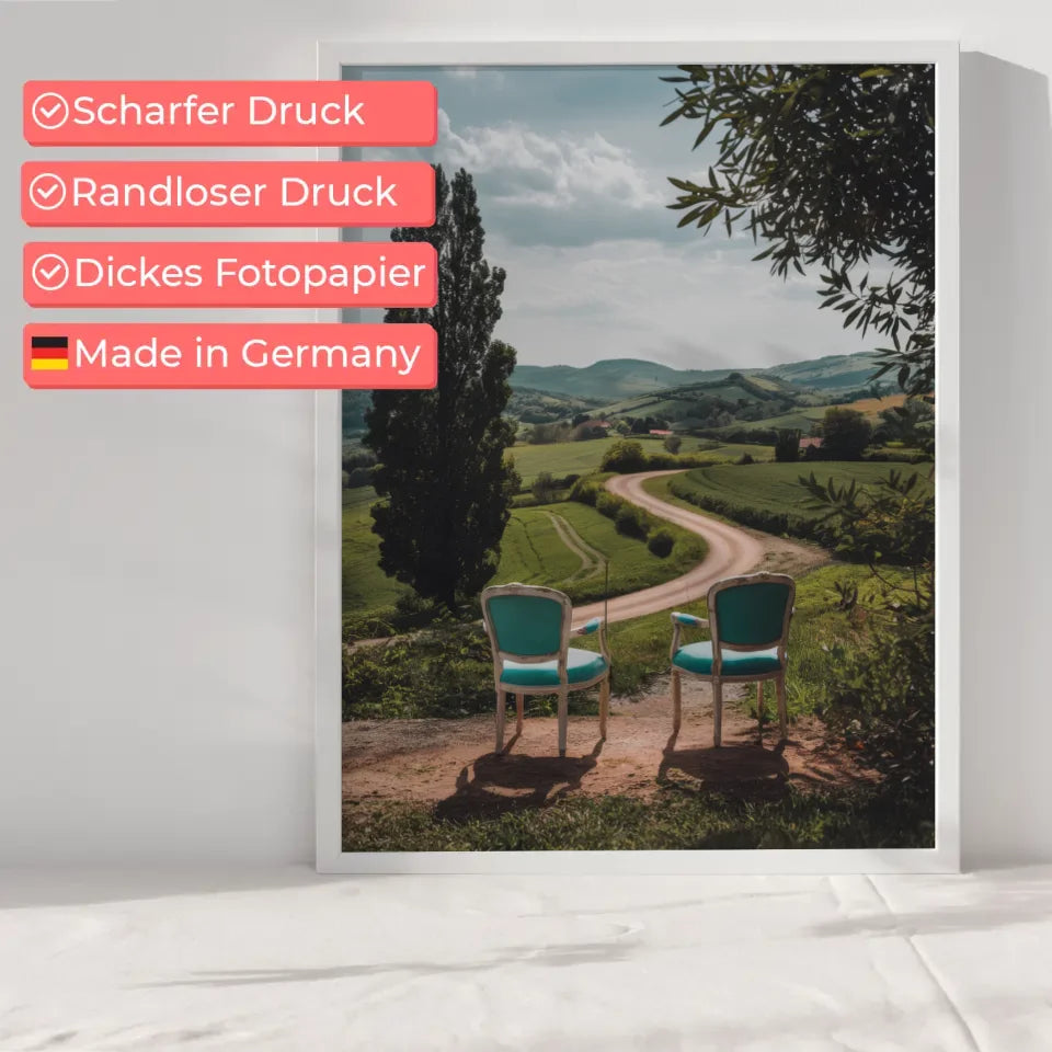 Gestalten Sie Ihre Wände mit diesem wunderschönen Poster malerische Landschaft mit Vintage Stühlen und Hügeln und lassen Sie sich von der Natur inspirieren. Perfekt für Wohnräume, Büros oder jeden Ort, an dem Sie eine positive Atmosphäre schaffen möchten. Das Wandbild ist in verschiedenen Größen erhältlich und passt sich ideal an jede Einrichtung an. Holen Sie sich jetzt Ihr persönliches Stück Natur ins Haus mit unserem beeindruckenden Poster!
