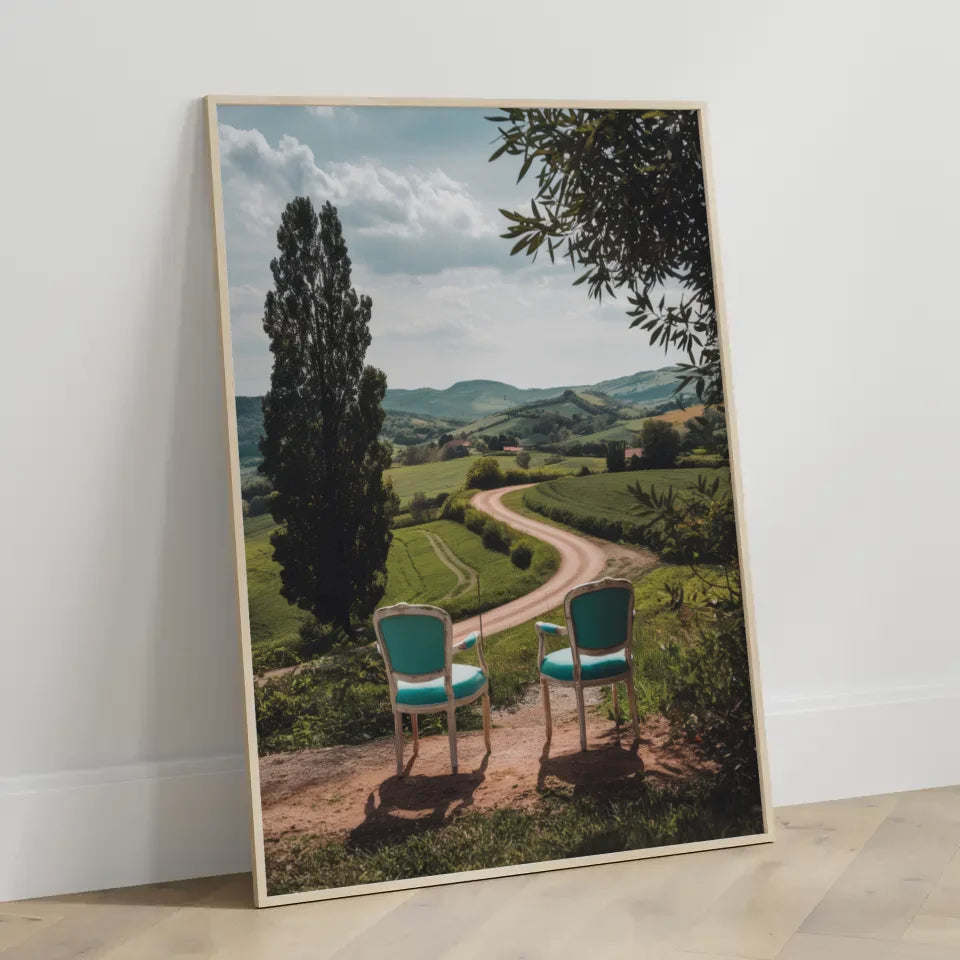 Entdecken Sie unser einzigartiges Poster malerische Landschaft mit Vintage Stühlen und Hügeln, das wunderbar in jede Natur- und Wohnraumausstattung passt. Dieses beeindruckende Wandbild fängt die Schönheit einer kurvenreichen, unbefestigten Straße ein, die sich durch üppige grüne Felder schlängelt. Die zwei Vintage-Stühle mit türkisfarbenen Sitzflächen, die am Straßenrand stehen, laden zum Verweilen und Genießen des Ausblicks ein. Der Blick auf die sanften Hügel in der Ferne sorgt für eine entspannte Atmosphäre.
