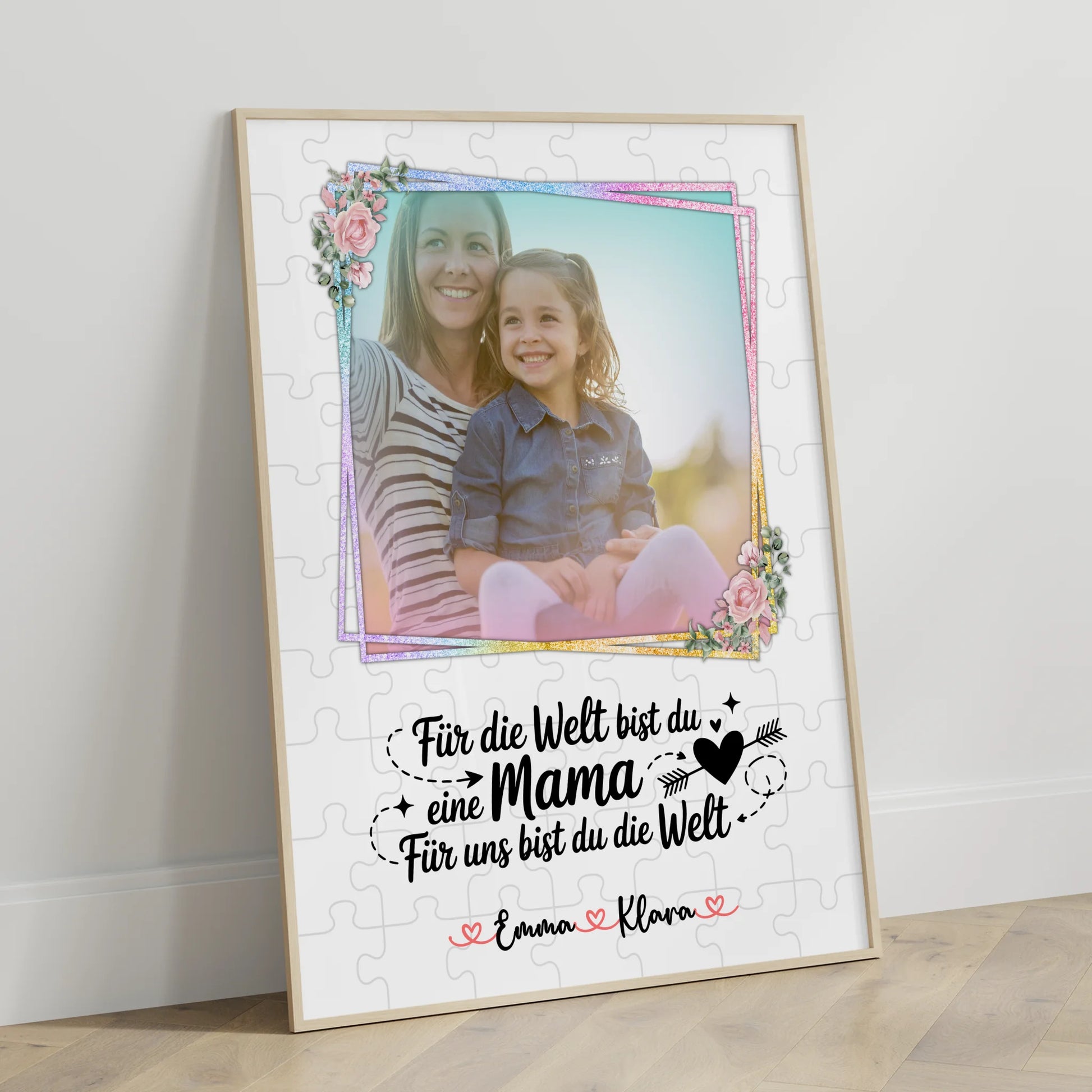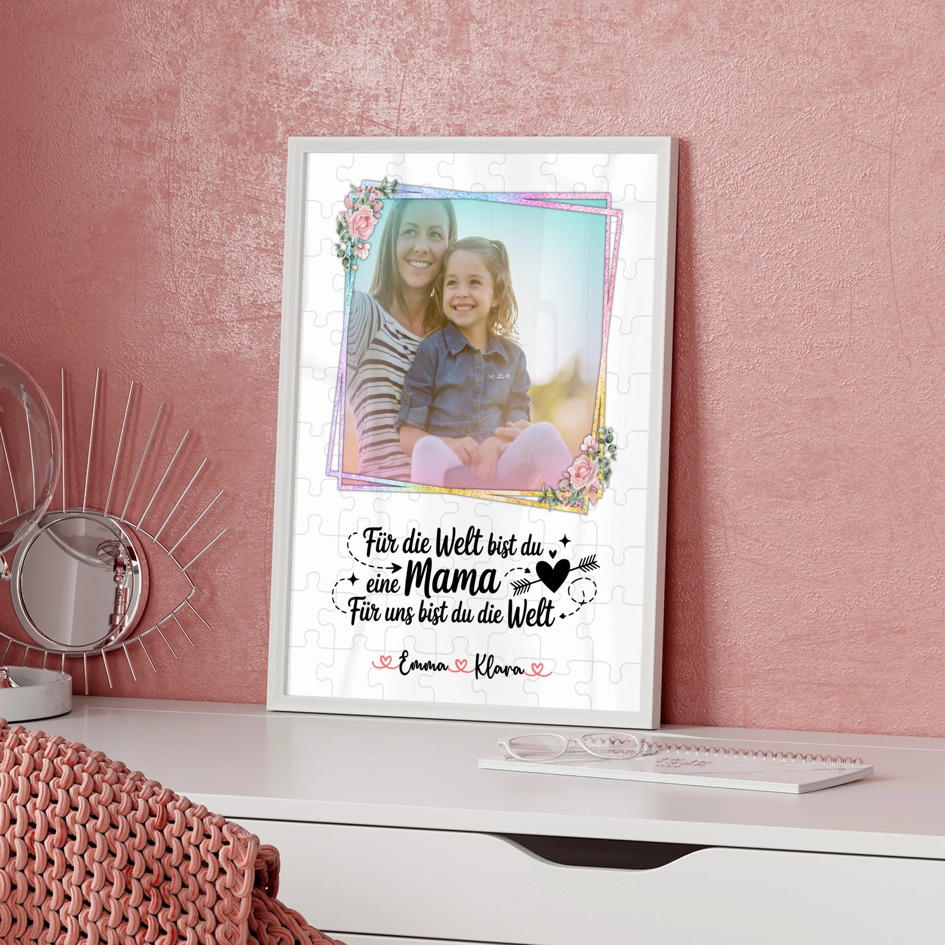 Entdecke ein persönliches Geschenk für Mama zum Muttertag: Dieses personalisierte Poster vereint Dein schönstes Foto, den Namen und einen eigenen Wunschtext zu einem emotionalen Fotoposter, das Erinnerungen sichtbar macht und das Zuhause verschönert. Das Design mit dem Spruch Für die Welt bist Du eine Mama. Für mich bist Du die Welt. wirkt besonders berührend und macht das Poster zu einem einzigartigen Muttertagsgeschenk.