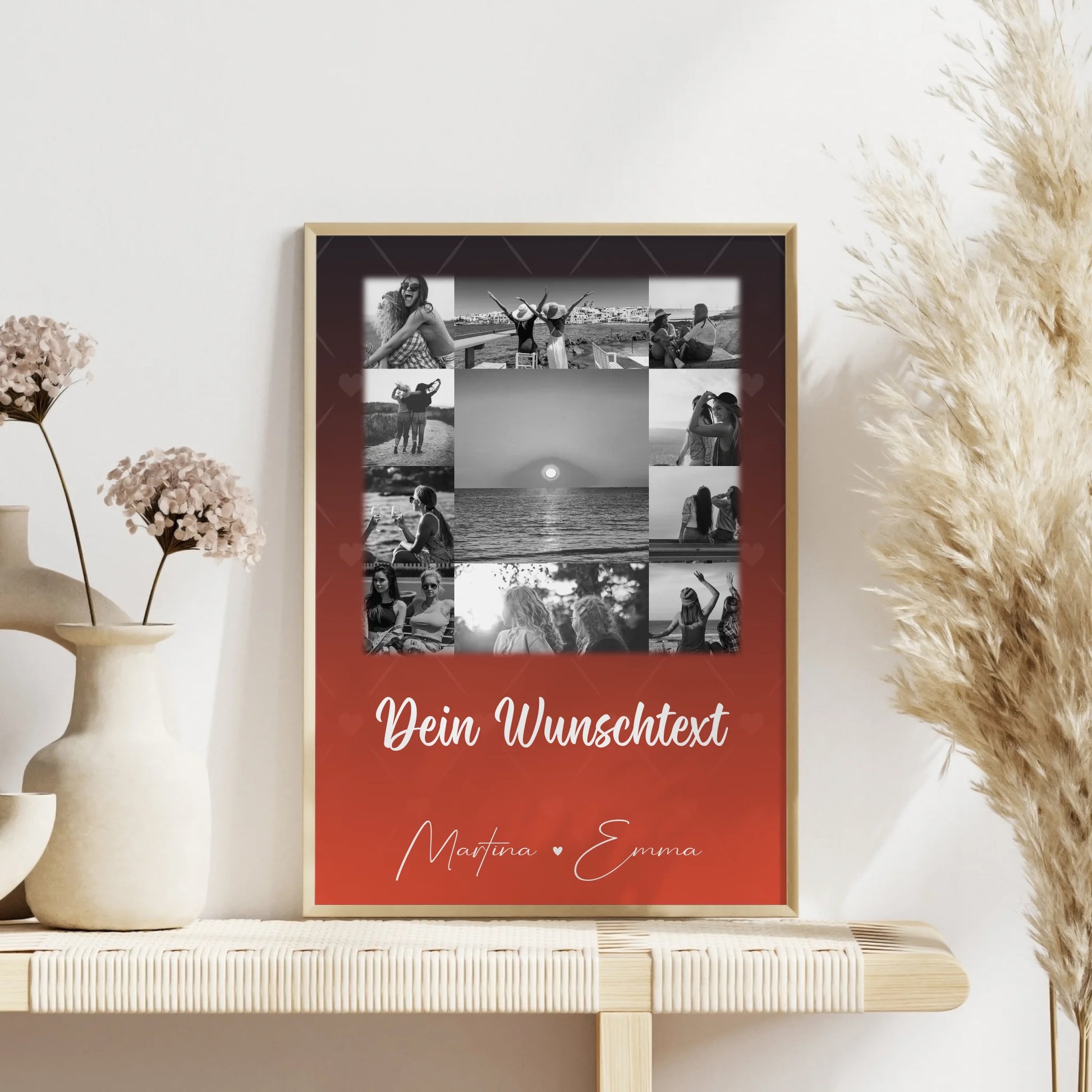 Mache dieses Geschenk so einzigartig wie die Beziehung zu deiner Mama. Du kannst das Poster ganz einfach personalisieren und zu einem echten Unikat machen. Lade deine 11 Lieblingsfotos hoch, die eure schönsten Erinnerungen zeigen. Füge eure Namen hinzu und kröne das Design mit einem eigenen Spruch oder einem liebevollen Wunschtext. So entsteht ein Geschenk, das direkt ins Herz trifft und deine persönliche Geschichte erzählt.