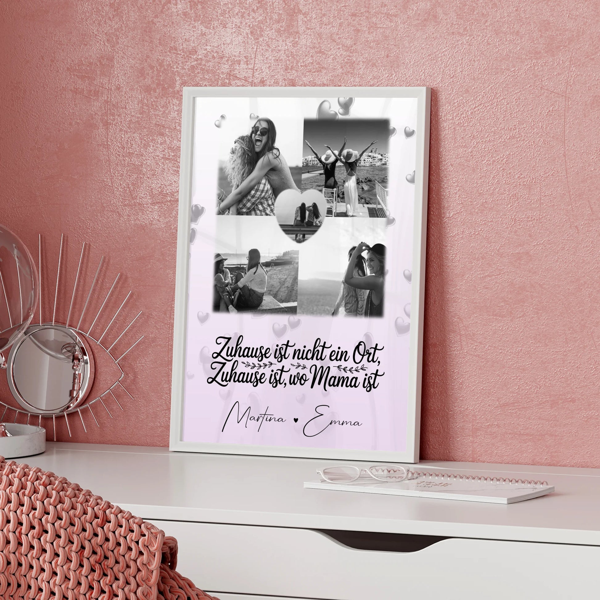 Überrasche die beste Mama der Welt mit einem Geschenk, das direkt von Herzen kommt! Unser einzigartiges Poster Mama Tochter mit 4 Fotos und 1 Herz Foto You make my heart smile ist mehr als nur eine Wanddekoration – es ist eine liebevolle Sammlung eurer schönsten gemeinsamen Momente. Der herzerwärmende Spruch You make my heart smile bringt eure besondere Verbindung auf den Punkt und zaubert deiner Mama garantiert ein Lächeln ins Gesicht. Es ist das ideale Fotogeschenk, um deine Liebe und Dankbarkeit auszudrücken.