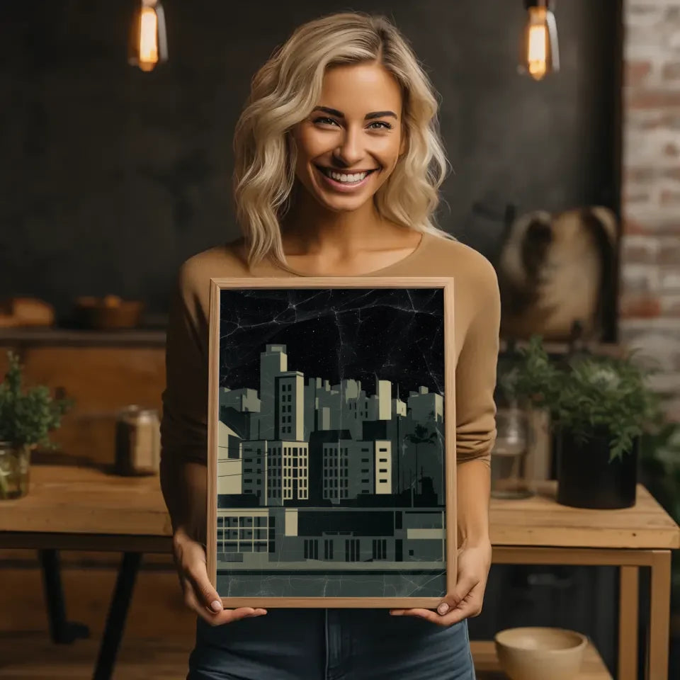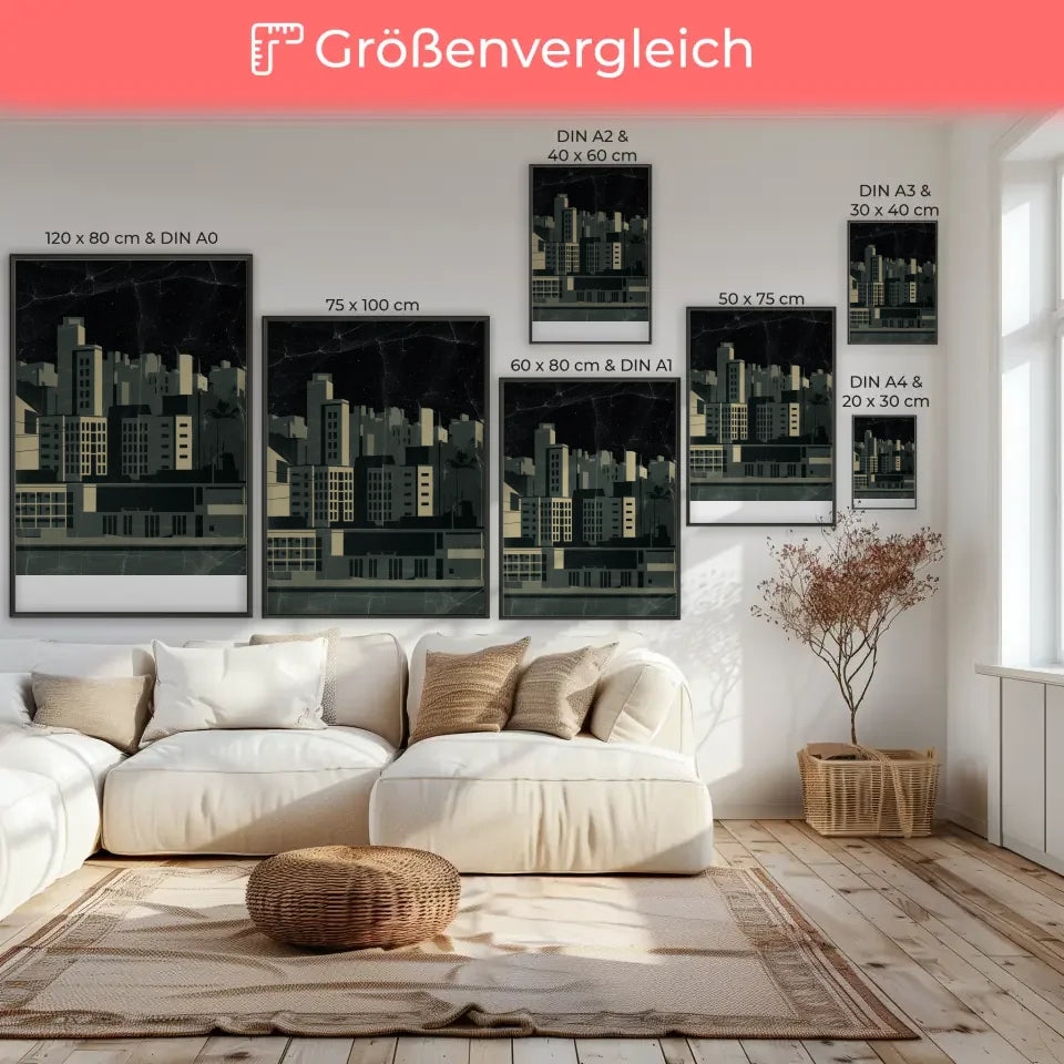 Verleihen Sie Ihrem Wohnraum oder Büro mit diesem abstrakten Poster eine stilvolle Note und lassen Sie sich von der künstlerischen Darstellung der urbanen Nachtlandschaft inspirieren. Dieses Kunstwerk ist nicht nur ein Blickfang, sondern auch ein Ausdruck Ihrer Persönlichkeit und Ihres Sinns für Design. Gestalten Sie Ihr Zuhause oder Ihre Arbeitsumgebung mit dem Poster minimale Stadtansicht nachts brutalistisch vintage – ein Must-have für Liebhaber zeitgenössischer Kunst.