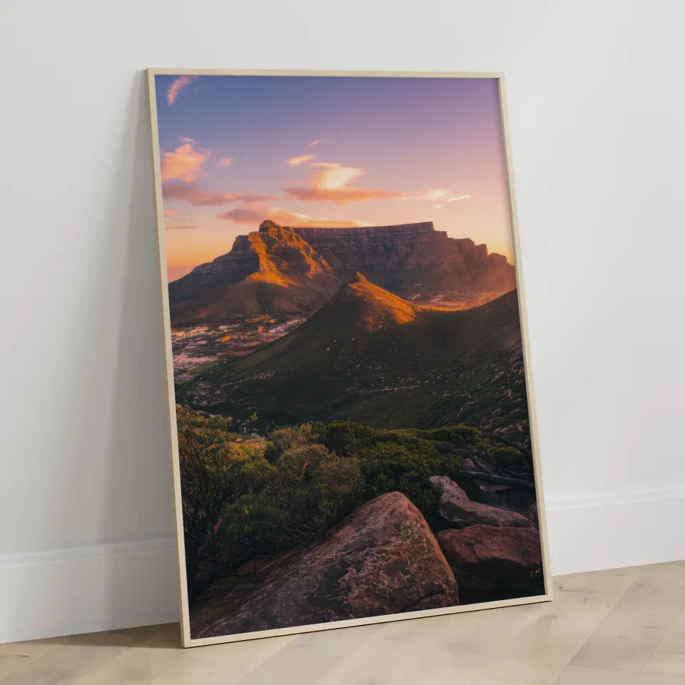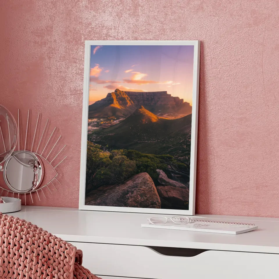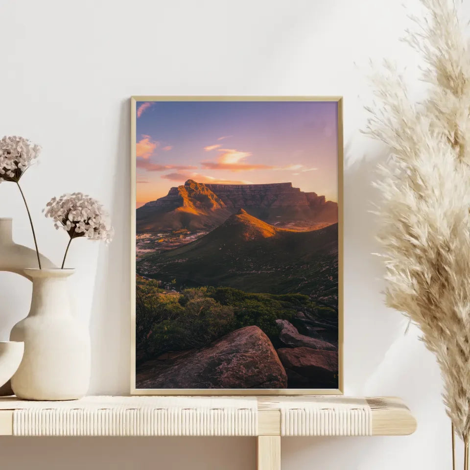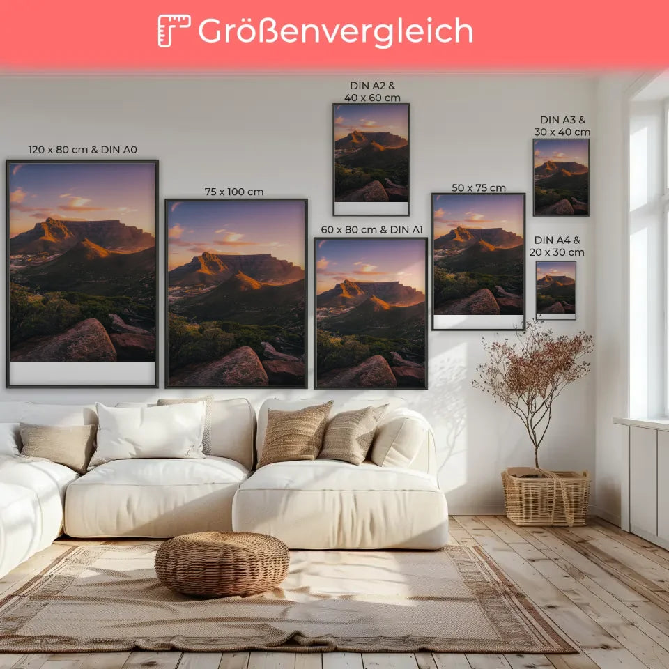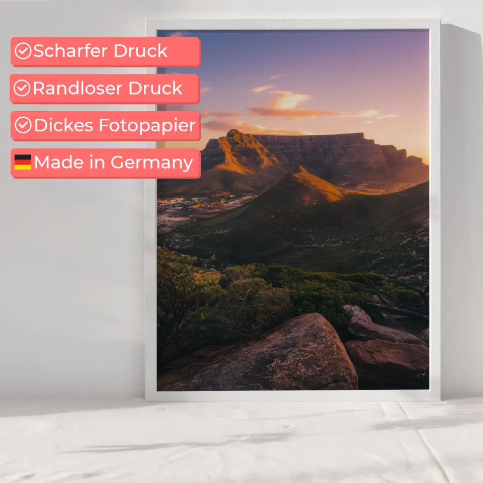 Dieses hochwertige Poster eignet sich hervorragend für Wohnzimmer, Büros oder jedes andere Ambiente, das eine elegante Note benötigt. Verleihen Sie Ihren Wänden Charakter und gestalten Sie Ihre persönliche Galerie mit unserem Poster Tafelberg Südafrika Panoramafoto zur Golden Hour. Bestellen Sie noch heute und bringen Sie die Magie dieser einzigartigen Landschaft in Ihr Zuhause!