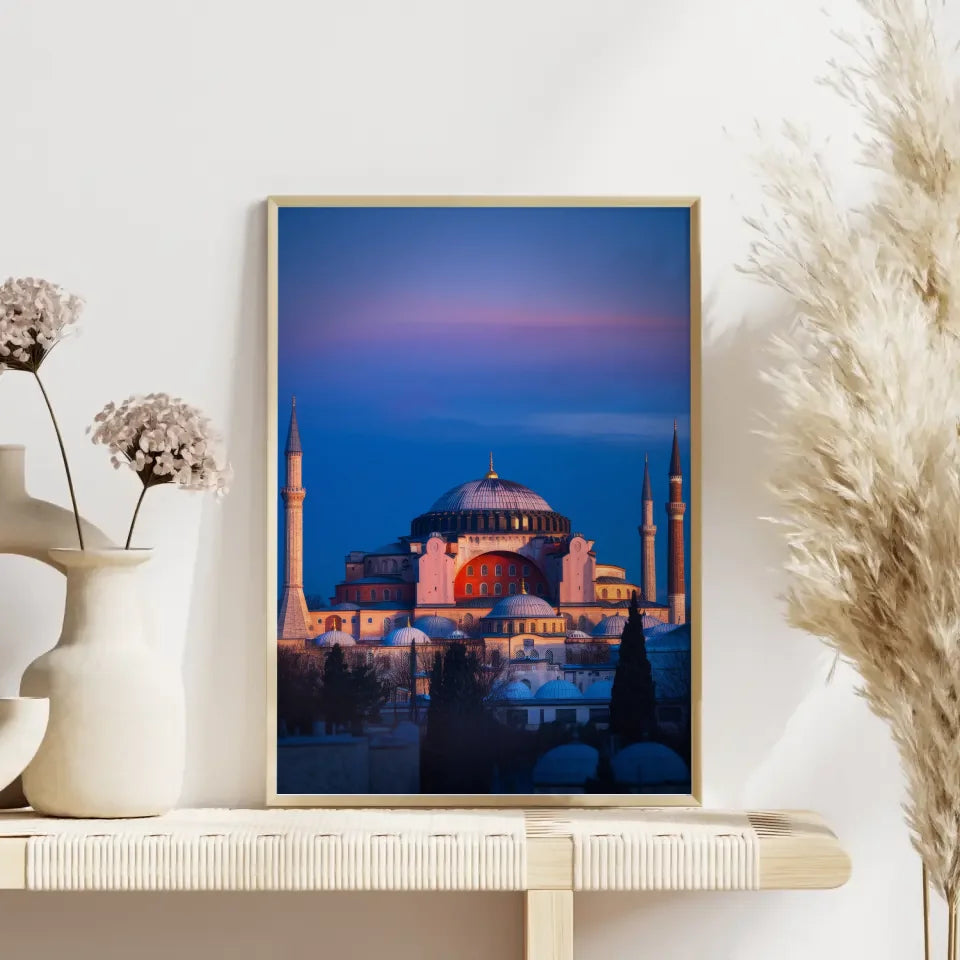 Ob als Geschenk oder zur Verschönerung Ihrer eigenen Räume, das Panoramafoto Hagia Sophia Poster zur Goldenen Stunde ist eine hervorragende Wahl für Kunstliebhaber und Reisefans gleichermaßen. Kombinieren Sie es mit anderen Wandbildern aus unserem Sortiment, um eine persönliche Galerie zu kreieren, die Ihre Leidenschaft für Reisen und Kultur widerspiegelt.