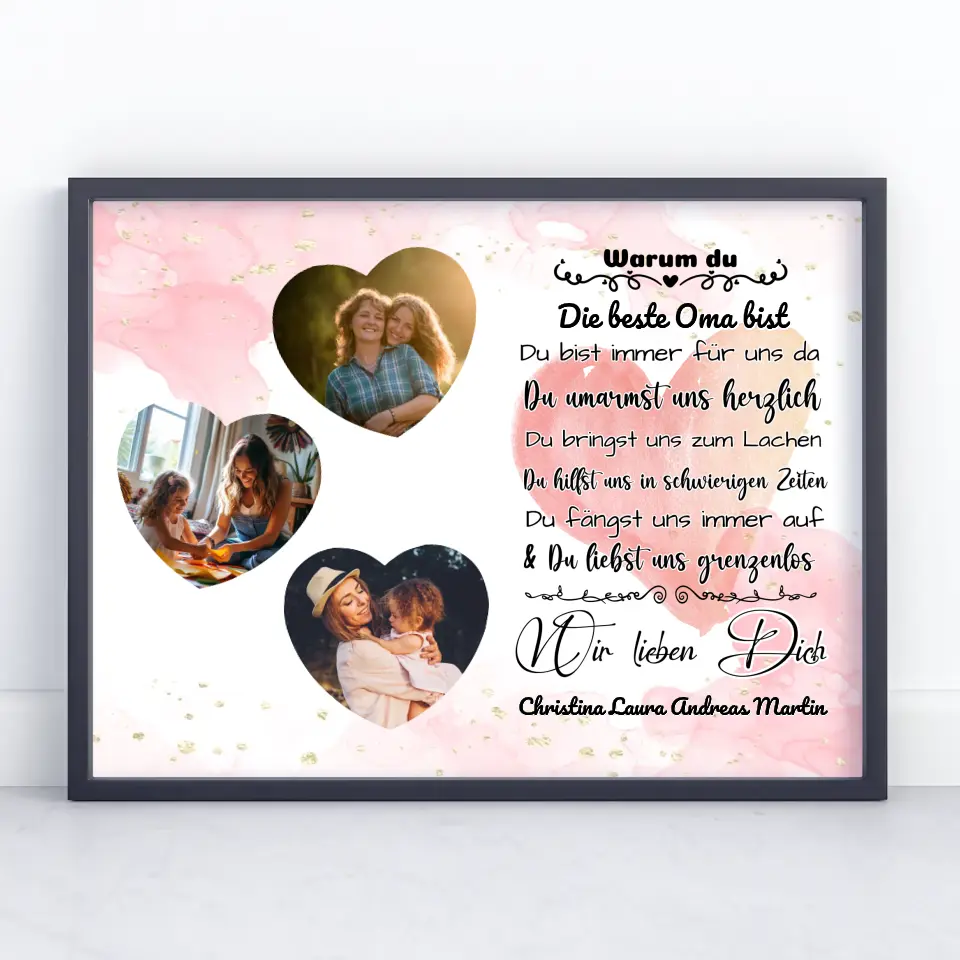 Du würdest gerne etwas einzigartiges schenken? Dann ist Unser Poster mit 3 Herz Fotos Oma Warum du die beste bist ein super schickes personalisiertes Geschenk.
