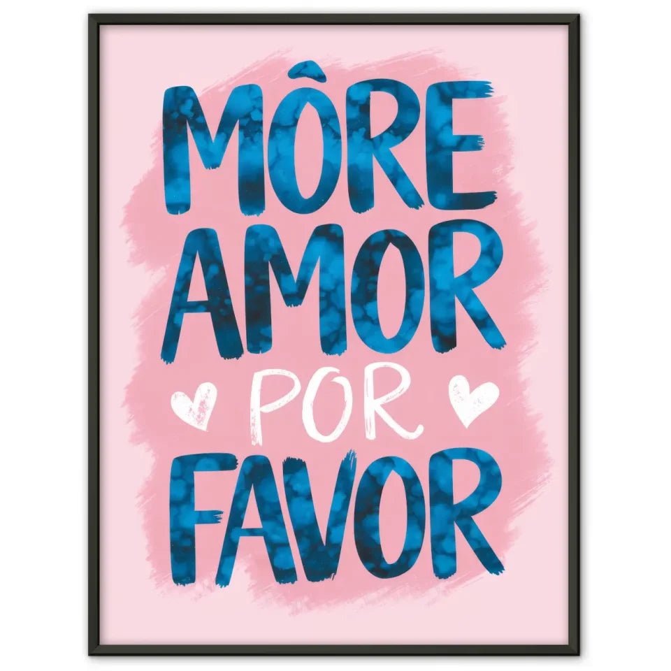 Das Poster zeigt die inspirierende Aufforderung 'MORE AMOR POR FAVOR“, wobei die Kombination aus englischen und spanischen Wörtern eine universelle Botschaft von Liebe und Zusammenhalt vermittelt. Ergänzt wird das Design durch ein kleines, weißes Herz unter dem Wort 'AMOR“, das dem Kunstwerk eine zusätzliche liebevolle Note verleiht. Diese Aquarell-Pinselillustration eignet sich ideal für Wohn-, Schlaf- oder Jugendzimmer und sorgt für eine freundliche Atmosphäre.