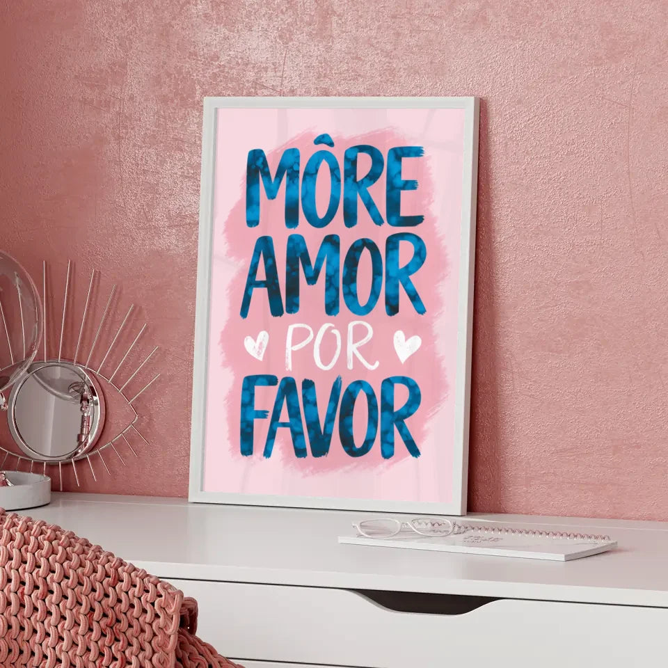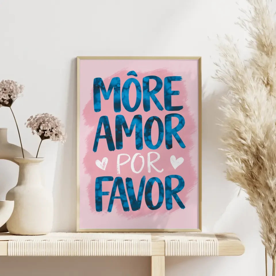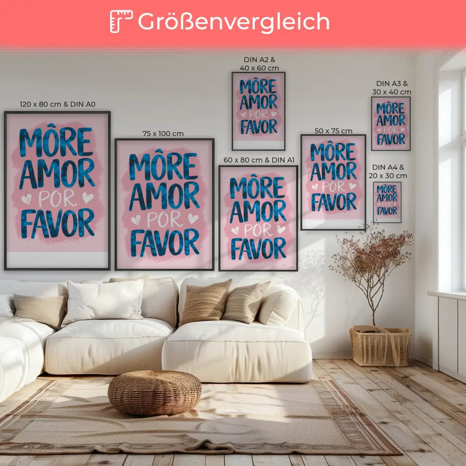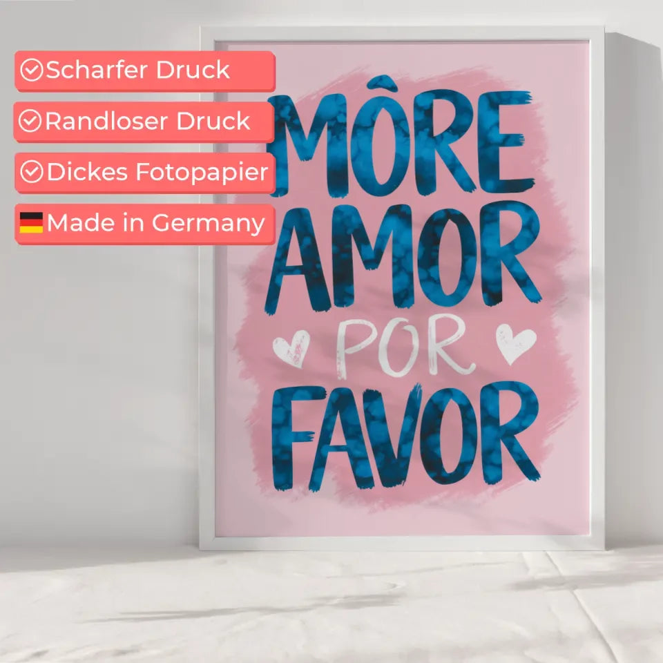 Verleihen Sie Ihrem Zuhause eine besondere Note mit unserem faszinierenden Poster mit Aquarell Illustration MORE AMOR POR FAVOR in Rosa. Dieses einzigartige Spruchbild bringt nicht nur Farbe in Ihre Räume, sondern auch eine positive Botschaft. Die großformatige, fette Schrift in Blau hebt sich wunderbar auf dem sanften rosa Hintergrund ab und zieht alle Blicke auf sich.