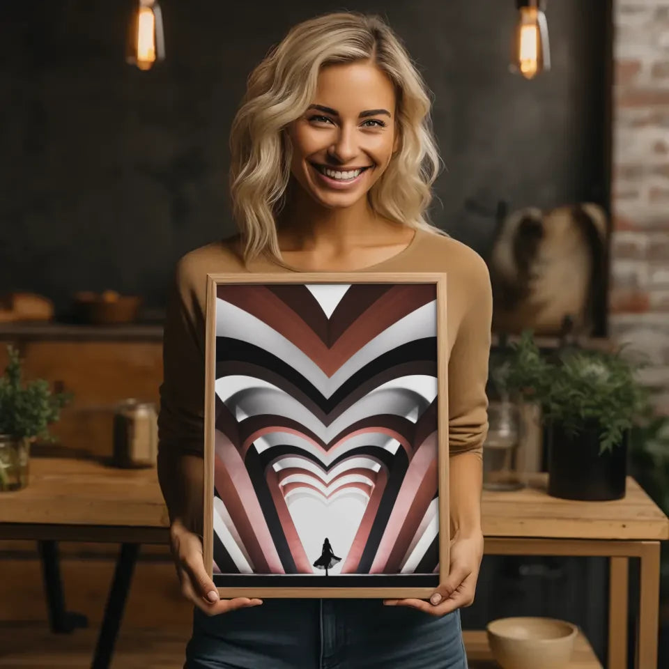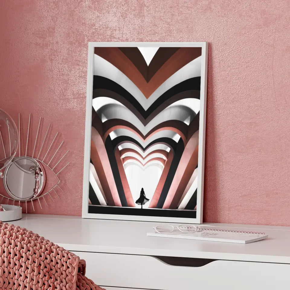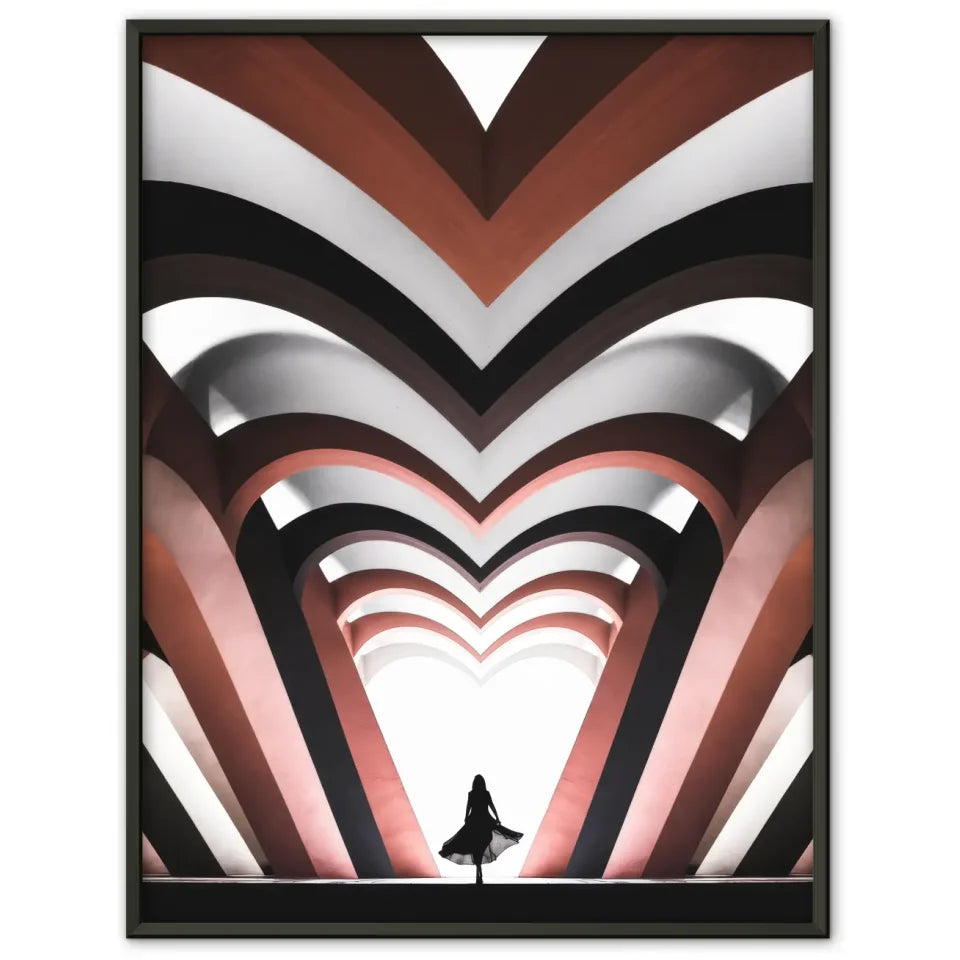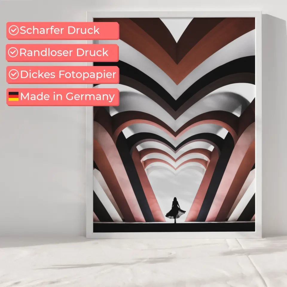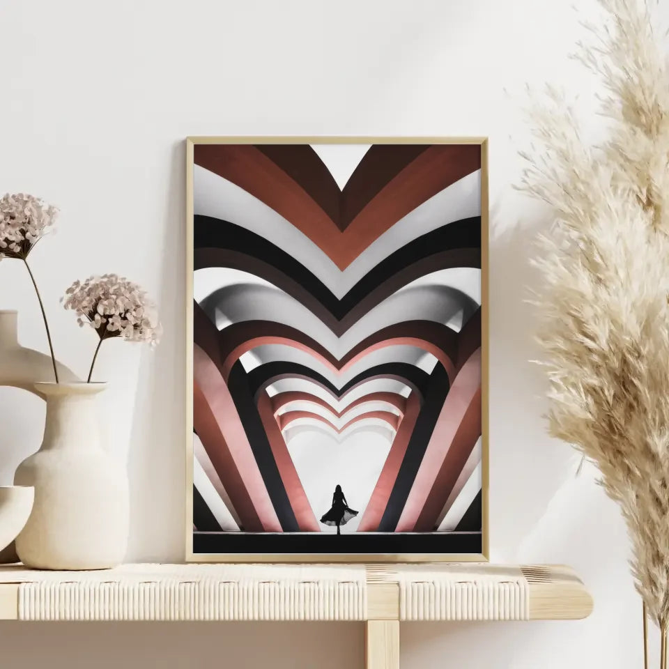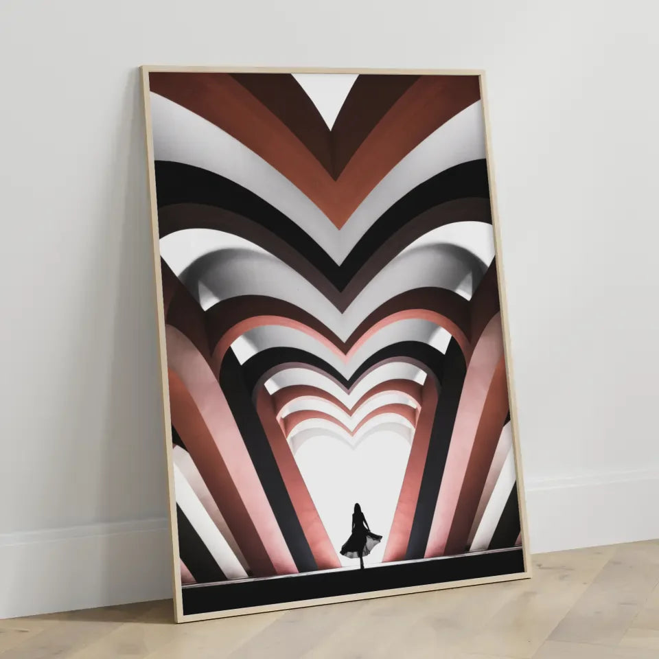 Unser einzigartiges Poster mit architektonischer Struktur und Frau im Lichtspiel ist das perfekte Kunstwerk für Ihr Zuhause. Dieses beeindruckende Poster zeigt eine symmetrische architektonische Struktur mit mehreren Bögen, die harmonisch auf eine zentrale Lichtquelle zulaufen. Die Bögen sind in ansprechenden Braun-, Weiß- und Schwarztönen gestaltet, die wunderbar miteinander harmonieren und Ihrem Raum eine stilvolle Atmosphäre verleihen.