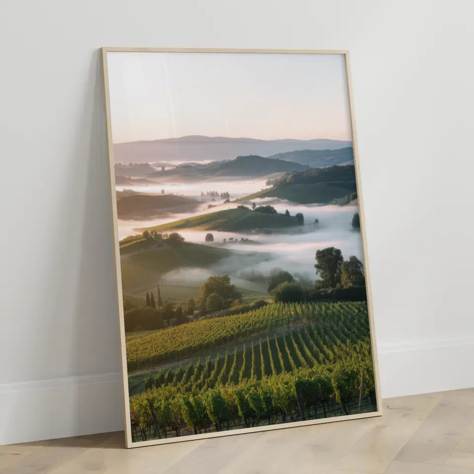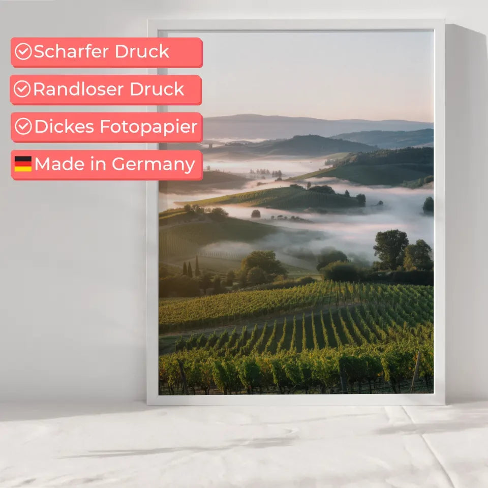 Entdecken Sie unser einzigartiges Poster mit atemberaubendem Landschaftsfoto von Weinbergen und Hügeln, das jedem Raum eine natürliche Eleganz verleiht. Dieses hochqualitative Poster zeigt eine beeindruckende Szenerie mit grünen Weinbergen und sanften Hügeln, die sanft vom Morgennebel umhüllt sind. Ideal für Naturliebhaber und als stilvolles Wohnaccessoire, zieht dieses Poster alle Blicke auf sich und schafft eine beruhigende Atmosphäre.