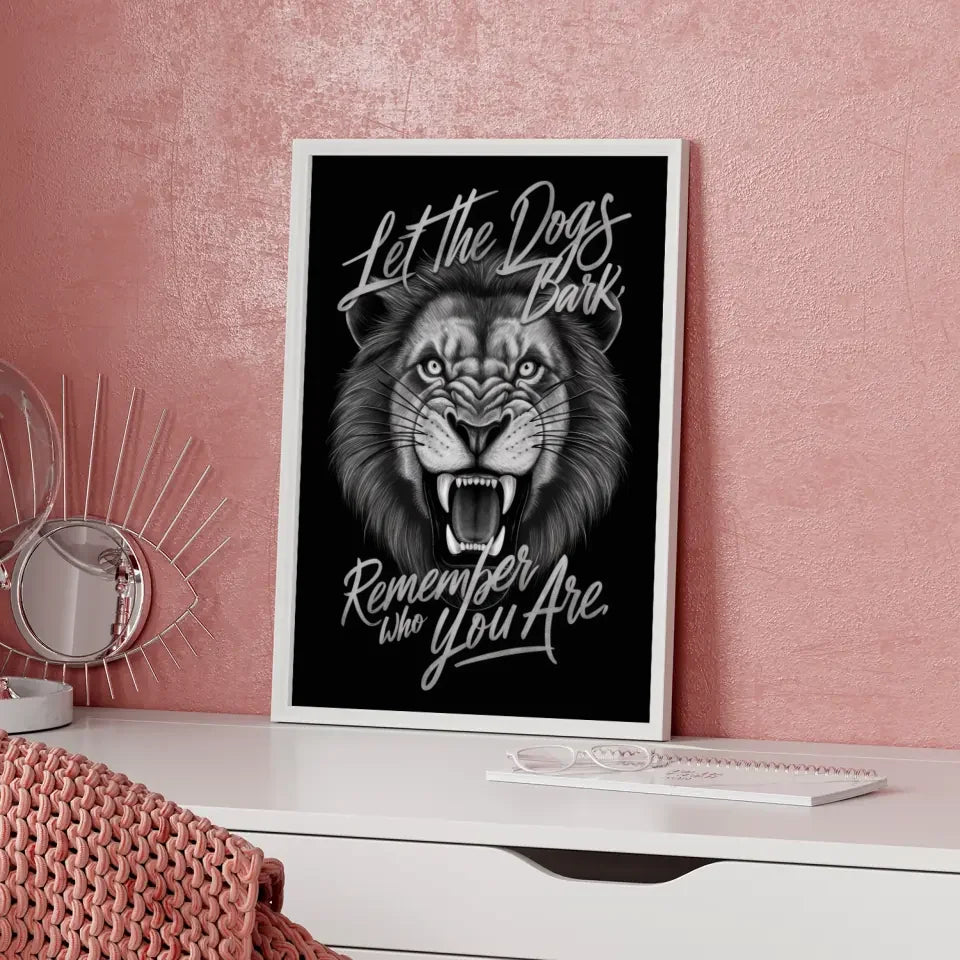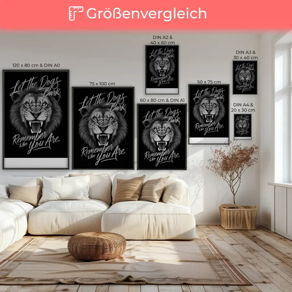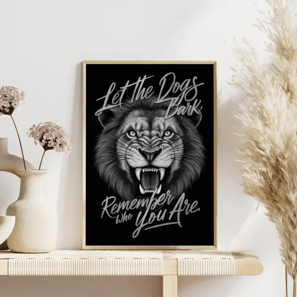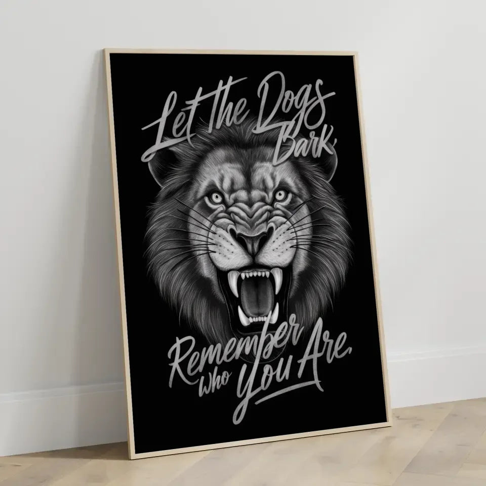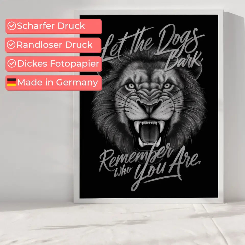 Über dem majestätischen Löwenkopf prangt das Zitat 'Lass die Hunde bellen, erinnere dich daran, wer du bist“ in fetter, kursiver Schrift in Grau. Diese inspirierende Botschaft ist nicht nur ein motivierendes Mantra für jeden Tag, sondern verwandelt jeden Raum in eine stimmungsvolle Atmosphäre. Der schwarze Hintergrund verstärkt die Präsenz des Posters und lässt das Design besonders wirken.