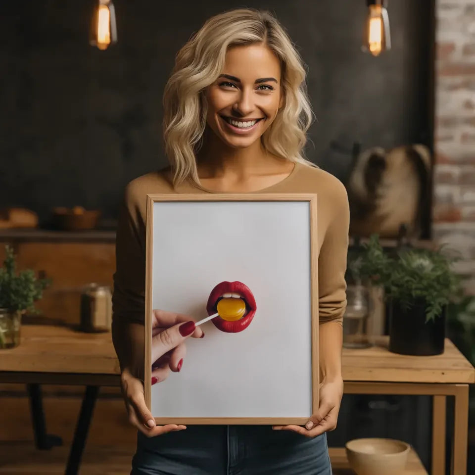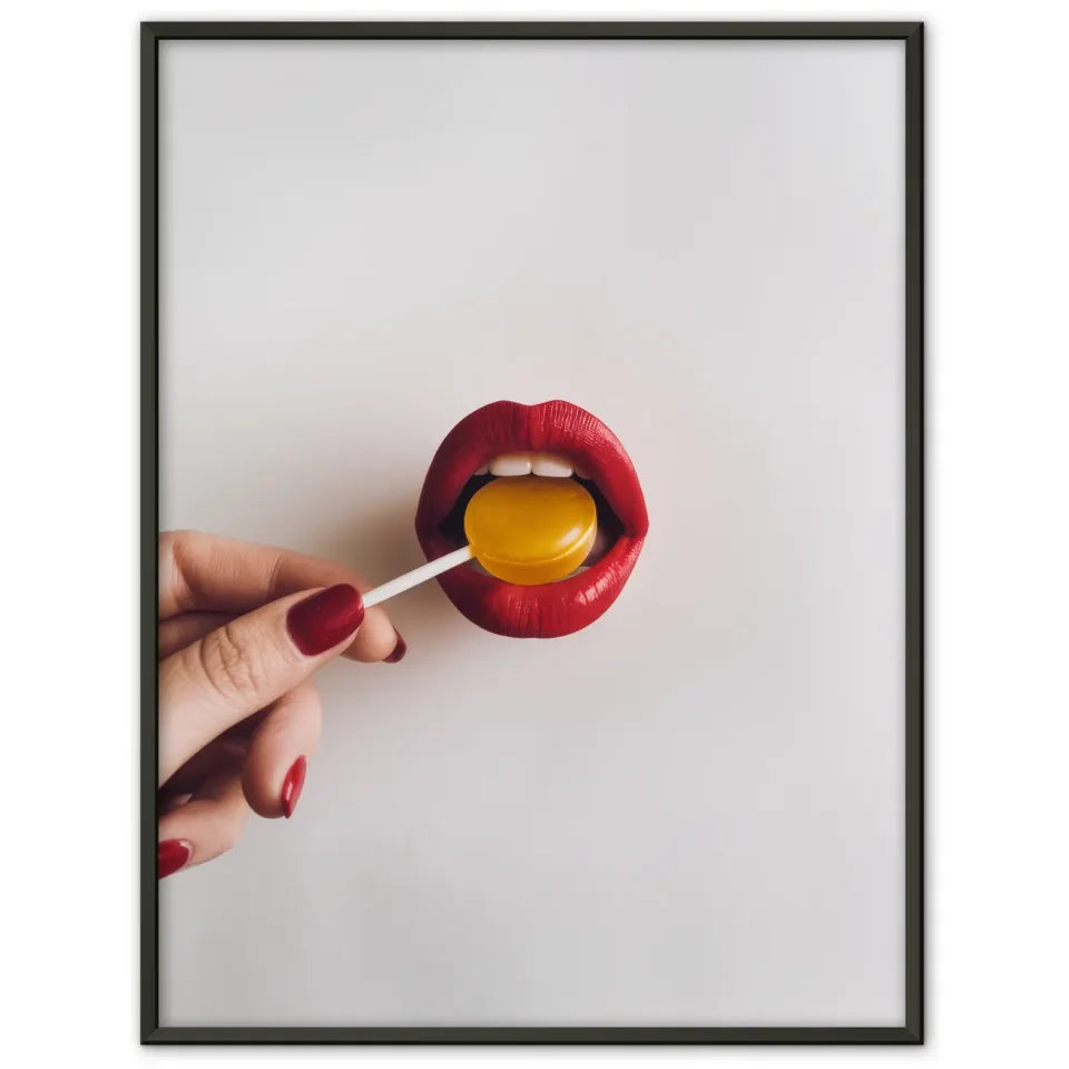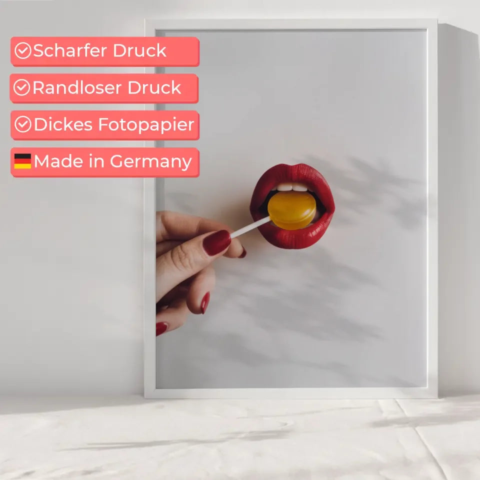 Entdecken Sie unser einzigartiges Poster mit roten Lippen und einem Lutscher Handmotiv, das jede Wand zu einem echten Hingucker macht. Dieses Kunstwerk vereint stilvolle Eleganz und verspielte Elemente, die perfekt in moderne Wohnräume passen. Die leuchtend roten Lippen, die eine einladende Pose einnehmen, ziehen sofort alle Blicke auf sich und verleihen Ihrem Zuhause eine lebendige Atmosphäre. Das Poster zeigt zudem eine Hand mit perfekt lackierten Nägeln, die den gelben Lutscher sanft auf die Lippen legt, wodurch ein künstlerisches Zusammenspiel entsteht.