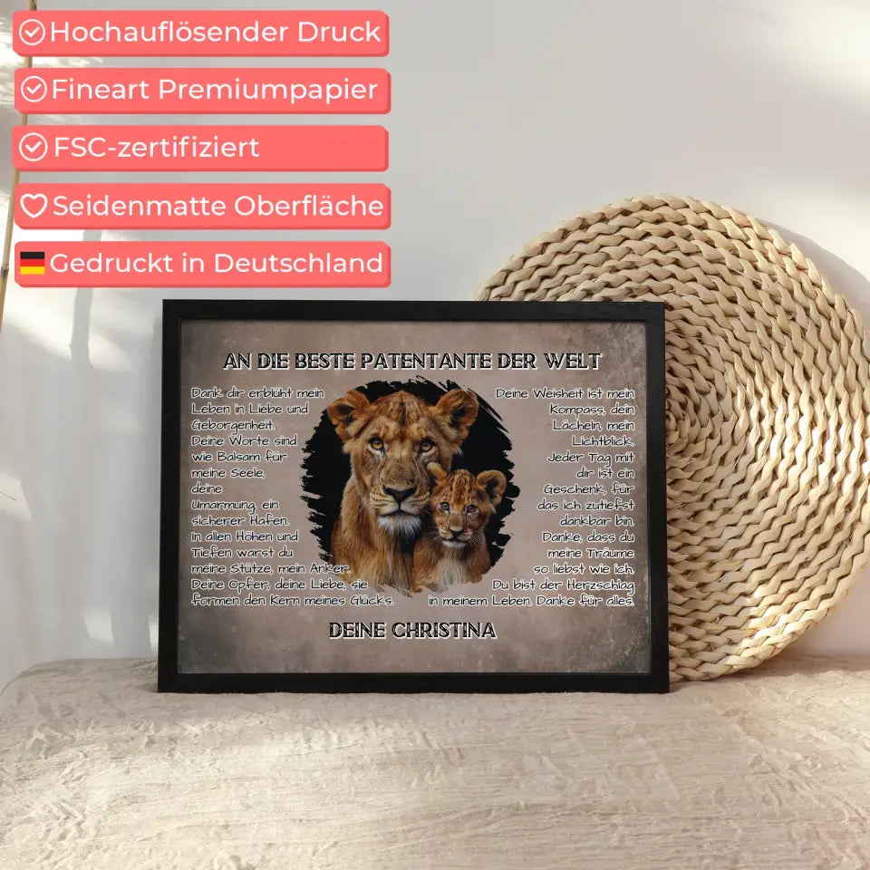 Du möchtest etwas einzigartiges verschenken? Dann ist Unser Poster mit Löwen für Patentante Danke für alles mit Löwen Bild ein perfektes und super schönes personalisiertes Geschenk.