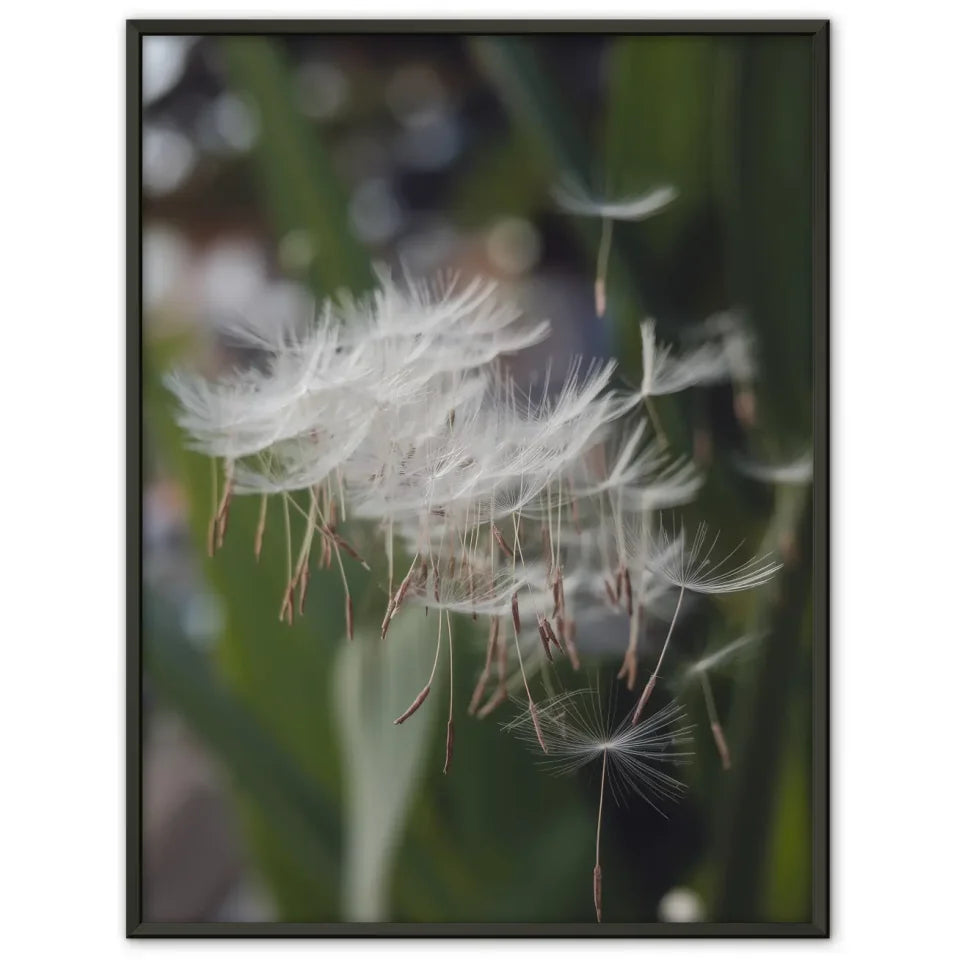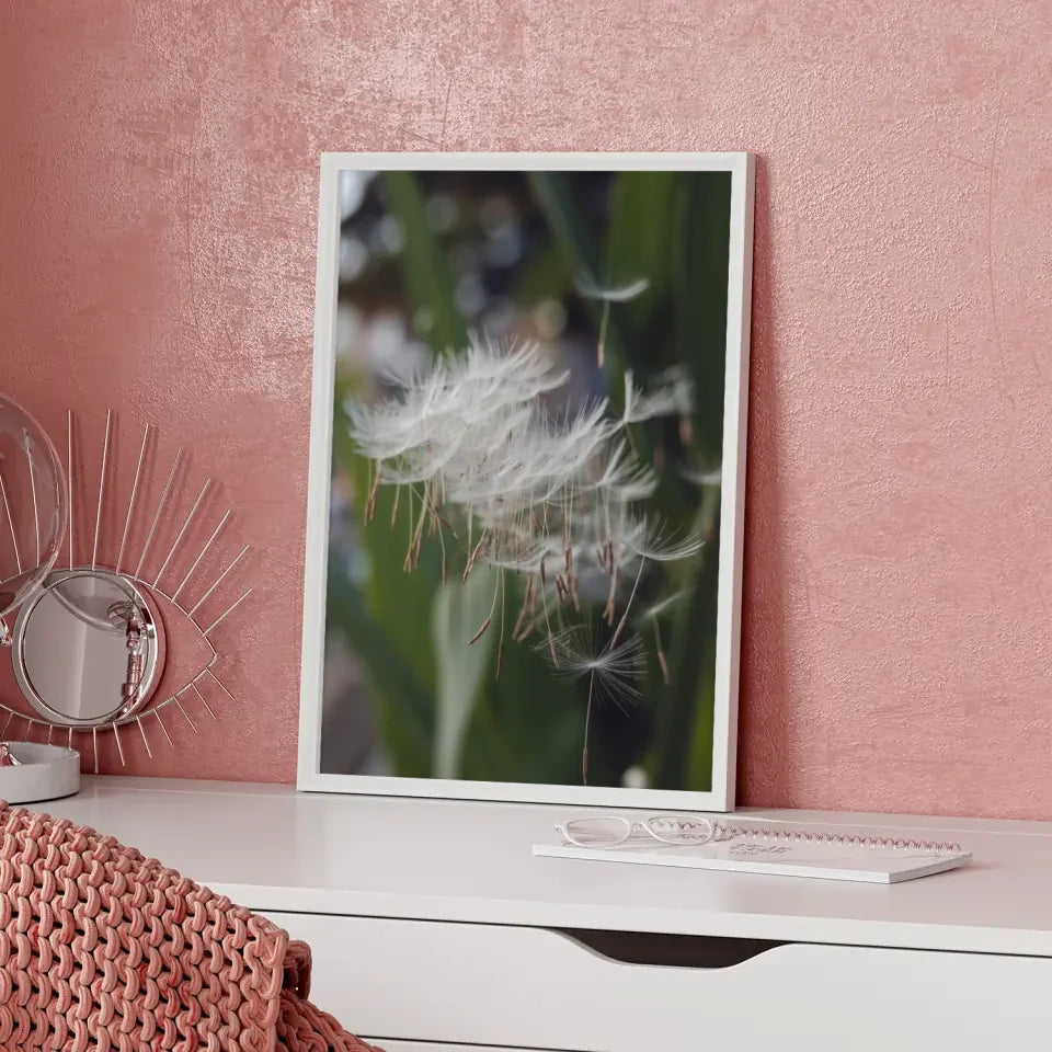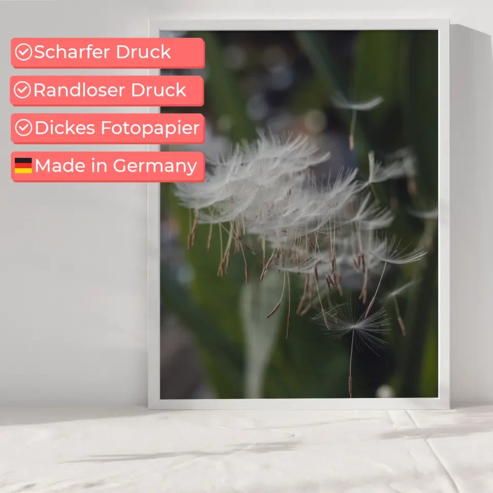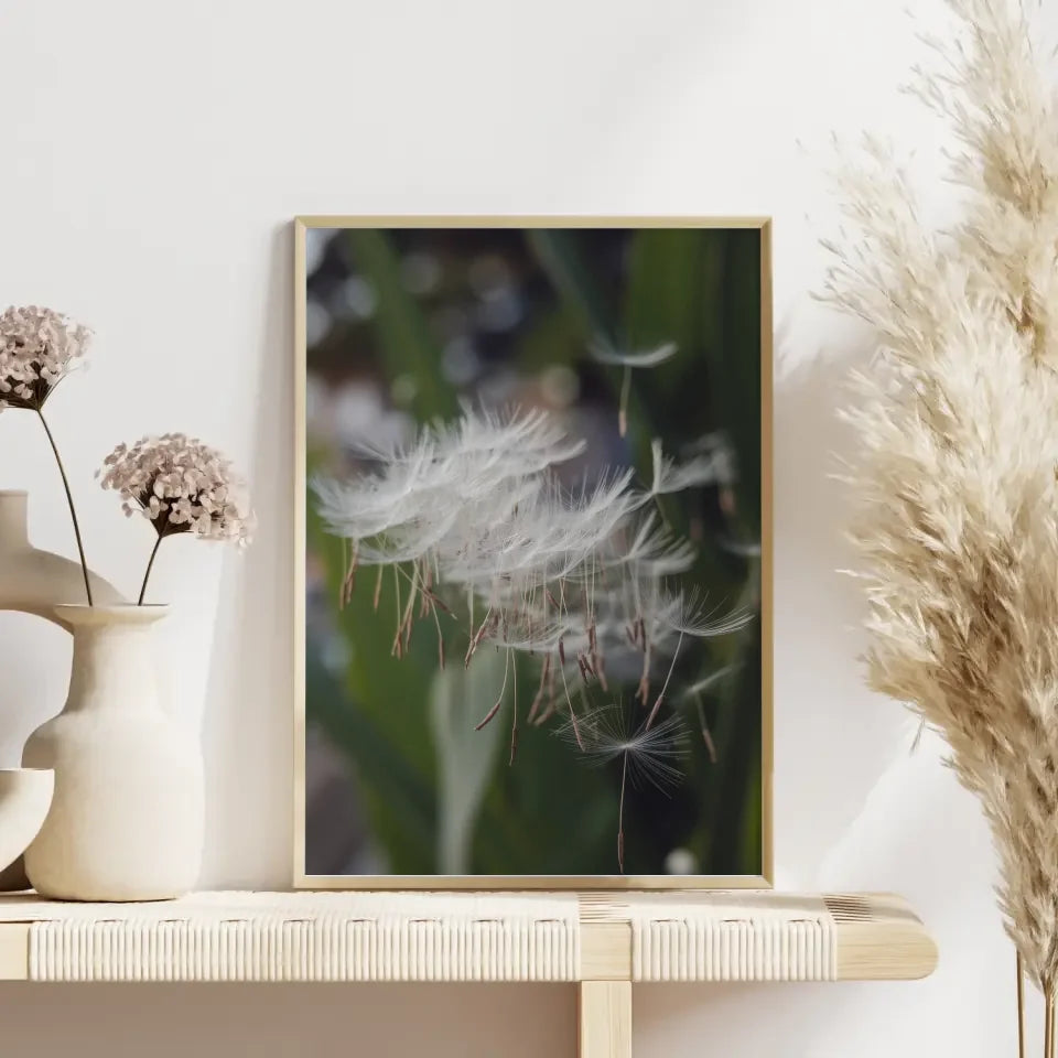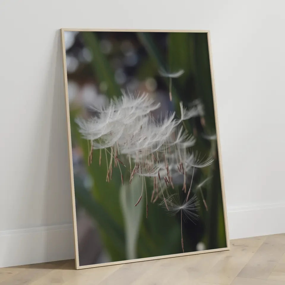 Verleihen Sie Ihrem Zuhause eine frische und natürliche Ausstrahlung mit unserem Poster mit Löwenzahnsamen im Flug. Diese wunderschöne Botanische Kunst zeigt eine Nahaufnahme von Löwenzahnsamen, die im Wind davonfliegen. Die filigranen, weißen Samen erinnern an kleine Fallschirme und sorgen für ein Gefühl von Leichtigkeit und Freiheit.