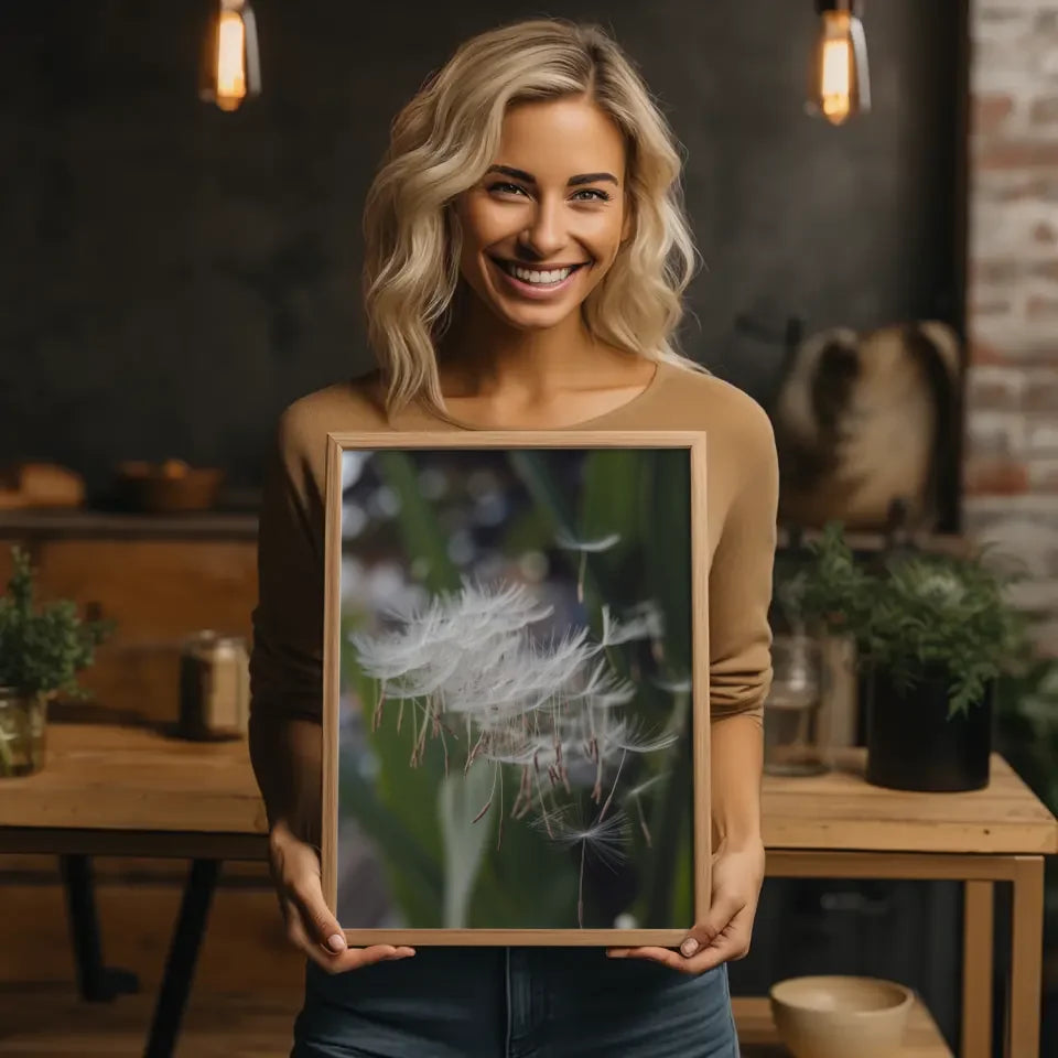 Gestalten Sie Ihre Wände neu und bringen Sie mit unserem Poster mit Löwenzahnsamen im Flug einen Hauch von Natürlichkeit in Ihr Interieur. Ideal für Botanik-Liebhaber und alle, die eine harmonische Wohnatmosphäre schaffen möchten.