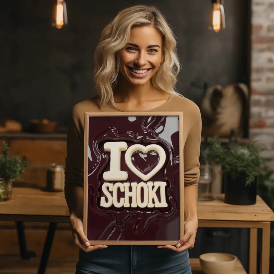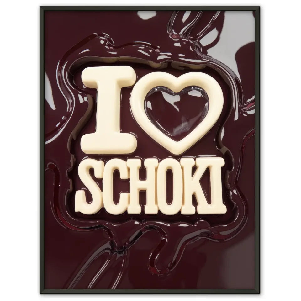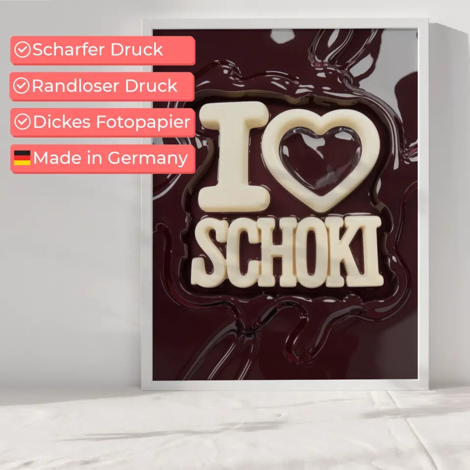Das Poster besticht durch seine kreative Gestaltung mit einem klebrigen, glänzenden Look, der an schmelzende Schokolade erinnert. Dunkelrote Flüssigkeitswirbel, die das Bild akzentuieren, verleihen dem Artwork einen dynamischen Touch. Der Text 'I 🤍 Schoki“ wirkt, als wäre er auf eine weiche, geschmeidige Oberfläche eingebettet, wodurch ein taktiles Erlebnis entsteht, das sowohl ansprechend als auch einzigartig ist.