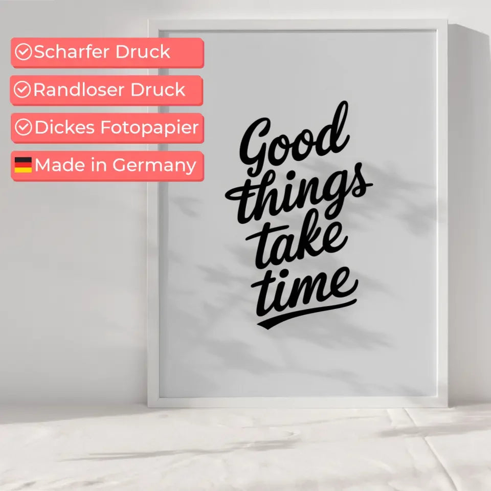 Bestellen Sie noch heute das minimalistische Poster Gute Dinge brauchen Zeit und erleben Sie, wie schnell Sie mit diesem einzigartigen Wandbild eine neue Stimmung in Ihren Räumen schaffen können. Ideal für alle, die den Wert von Geduld und Zeit schätzen.