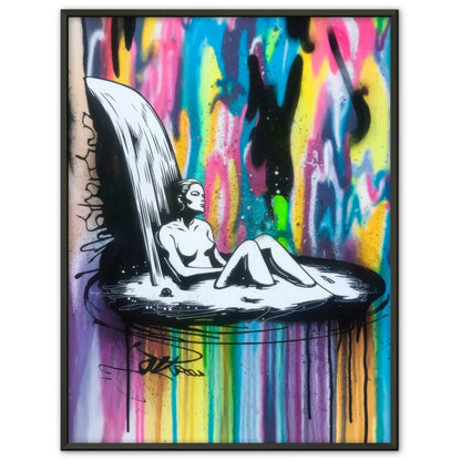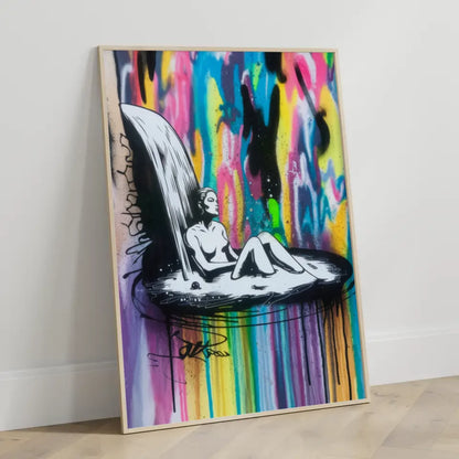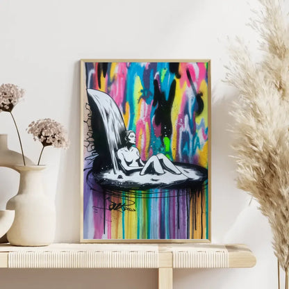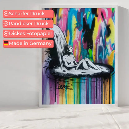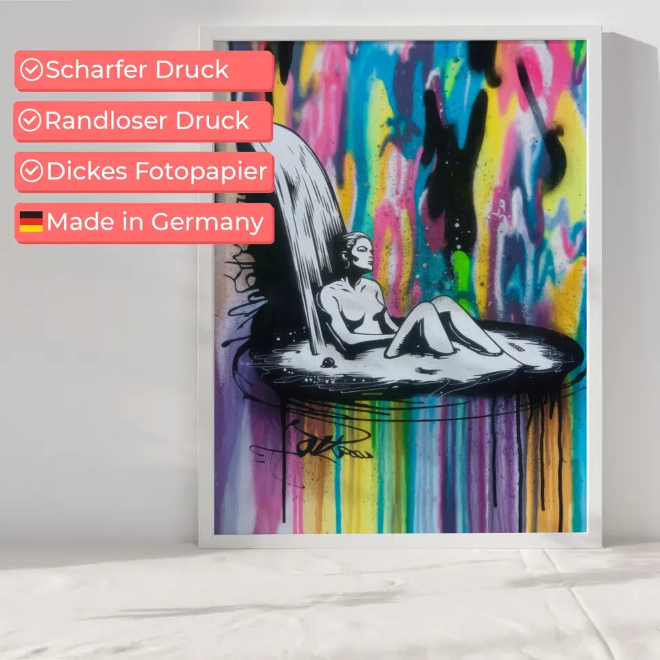 Entdecken Sie unser einzigartiges Poster mit einer modernen, minimalistischen Illustration einer Frau, die inmitten einer faszinierenden Tintenkaskade badet. Dieses beeindruckende Poster zeigt die Silhouette der Frau in kräftigem Schwarz und Weiß, die einen spannenden Kontrast zu dem lebendigen, mehrfarbigen Tintenwasserfall bildet, der die gesamte Leinwand umhüllt.