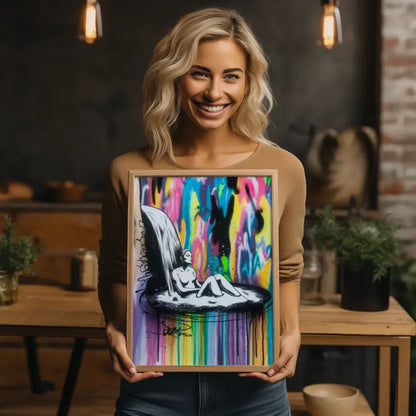 Die geschickte Kombination von Form und Farbe in diesem Poster schafft ein visuell fesselndes Erlebnis, welches das Auge des Betrachters anzieht und zum Nachdenken anregt. Die Graffiti-Elemente verleihen der Illustration eine urbanen Flair und verstärken die emotionale Wirkung des Kunstwerks.