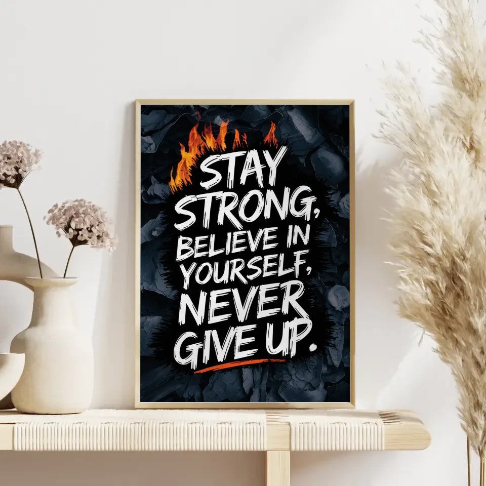 Poster mit motivierendem Zitat 'Bleib stark, glaube an dich selbst“