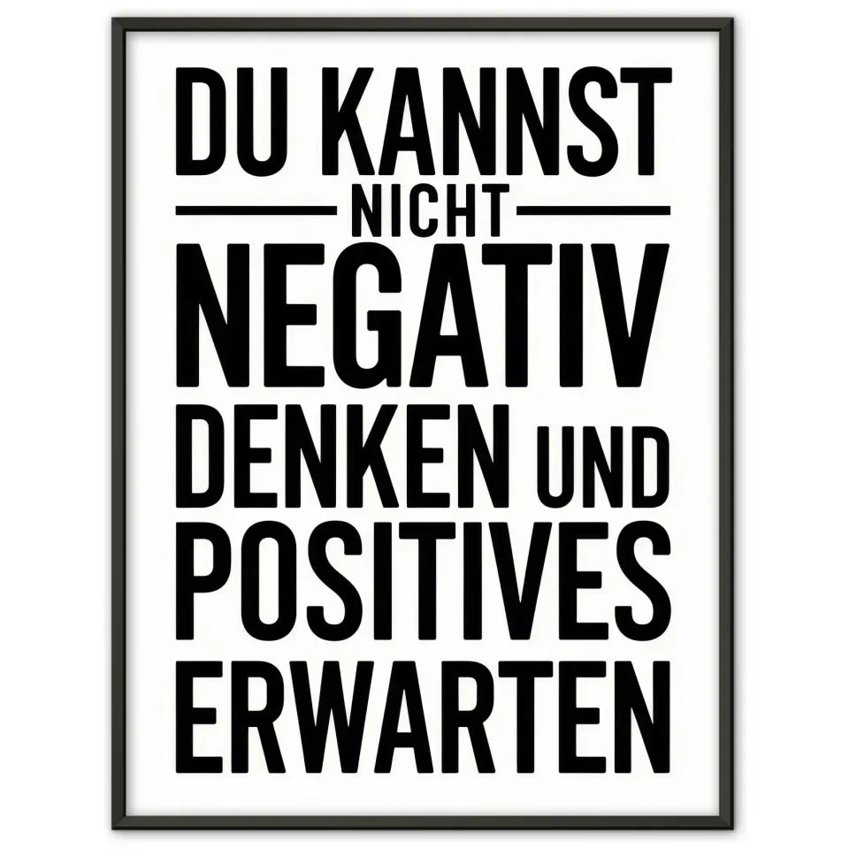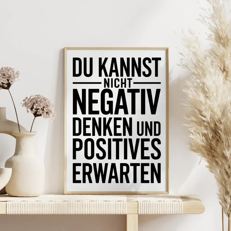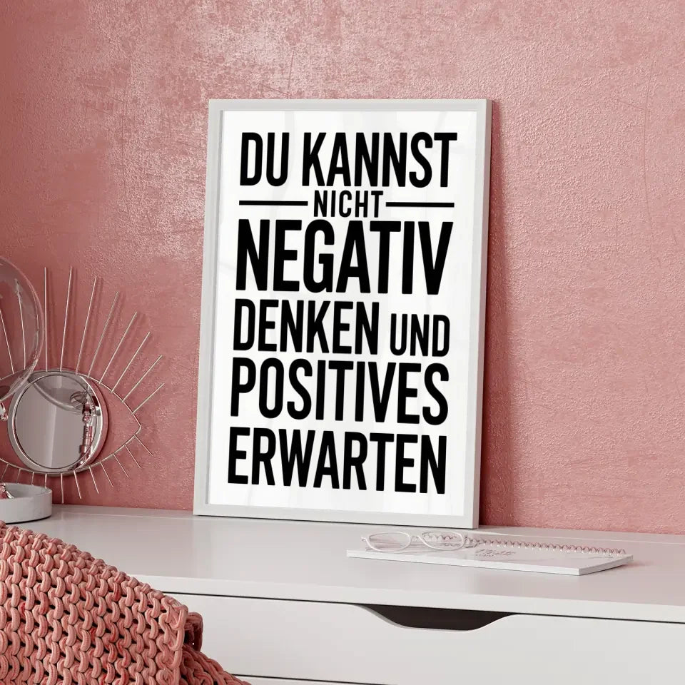 Entdecke unser einzigartiges Poster mit positiver Botschaft, das speziell für dein Zuhause entworfen wurde. Dieses inspirierende Poster trägt die kraftvolle Aussage DU KANNST NICHT NEGATIV DENKEN UND POSITIVES ERWARTEN“ in imposantem Fettdruck und Großbuchstaben. Der moderne, serifenlose Schriftstil sorgt dafür, dass die Botschaft klar und eindrucksvoll vermittelt wird.