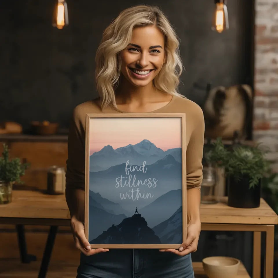 Das Zitat 'Find Stillness Within“ ist sanft in den Morgennebel eingraviert und fügt sich perfekt in die beruhigende Szenerie ein. Dieses Poster ist nicht nur ein dekoratives Element, sondern auch eine Einladung zur Besinnung und zur Suche nach innerem Frieden. Die Kombination aus ergreifender Natur und meditativem Thema macht dieses Poster zu einem idealen Ergänzung Ihrer Wohnräume.