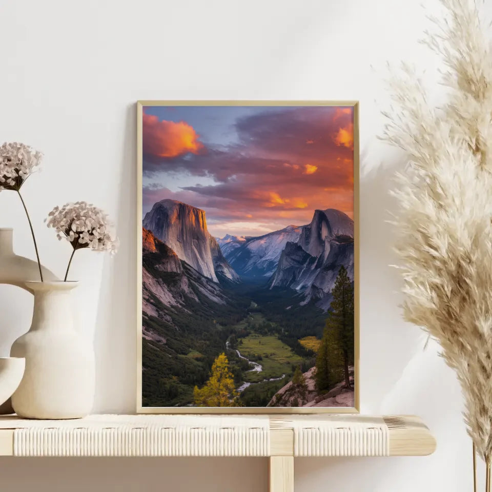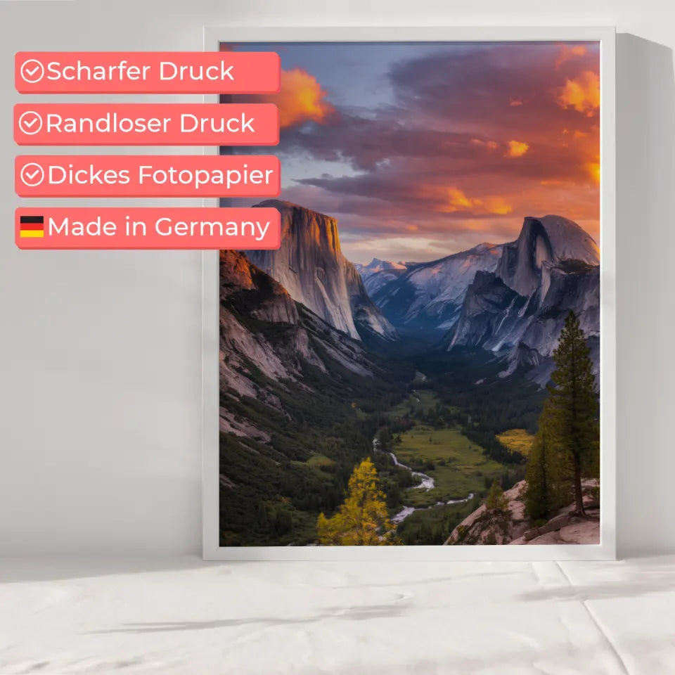 Entdecken Sie unser atemberaubendes Poster Yosemite Nationalpark Panoramafoto zur Golden Hour, das die majestätische Schönheit des berühmten Nationalparks in den USA einfängt. Dieses beeindruckende Wandbild zeigt die sanften Lichtverhältnisse der goldenen Stunde und versetzt jeden Betrachter in Staunen. Der Yosemite Nationalpark ist nicht nur ein beliebtes Reiseziel, sondern auch eine Quelle inspirierender Motive für Kunstliebhaber.