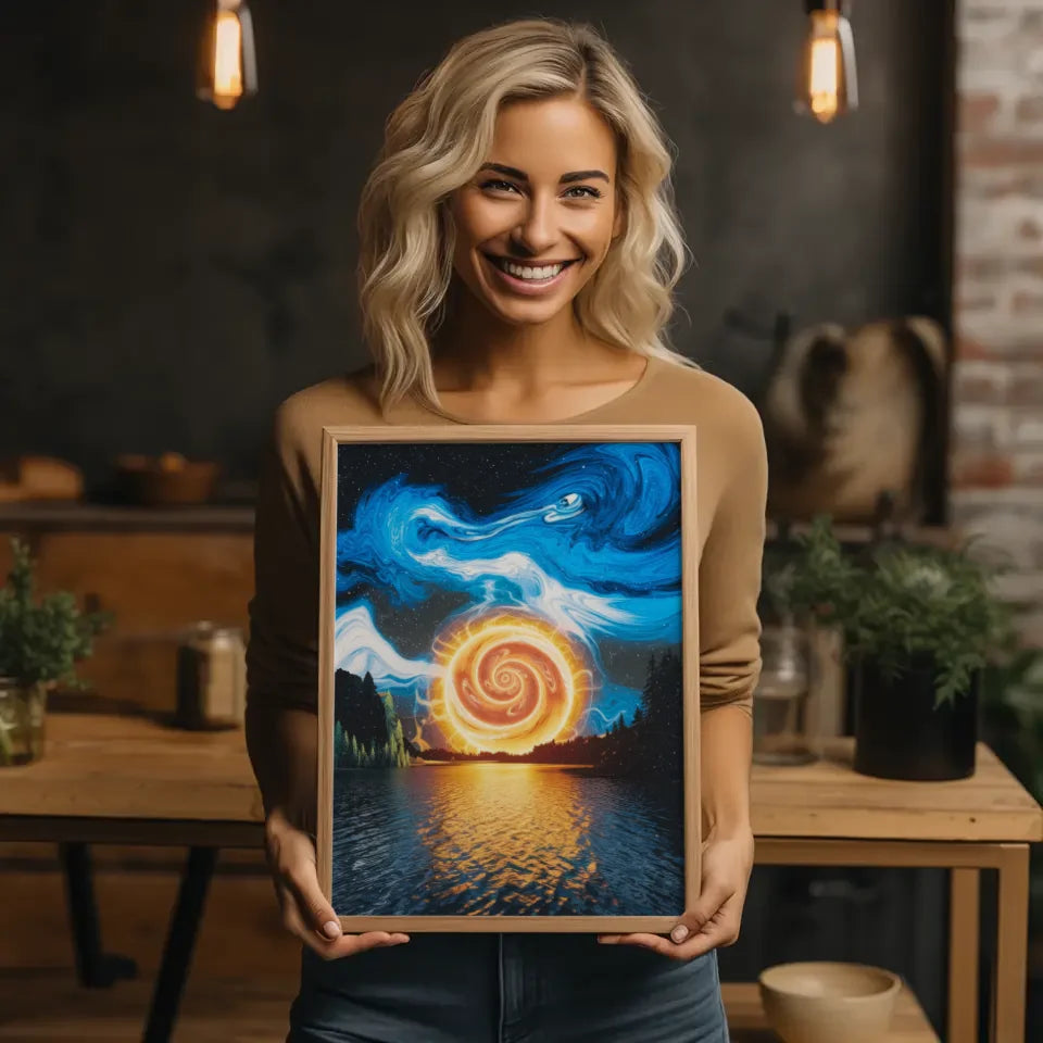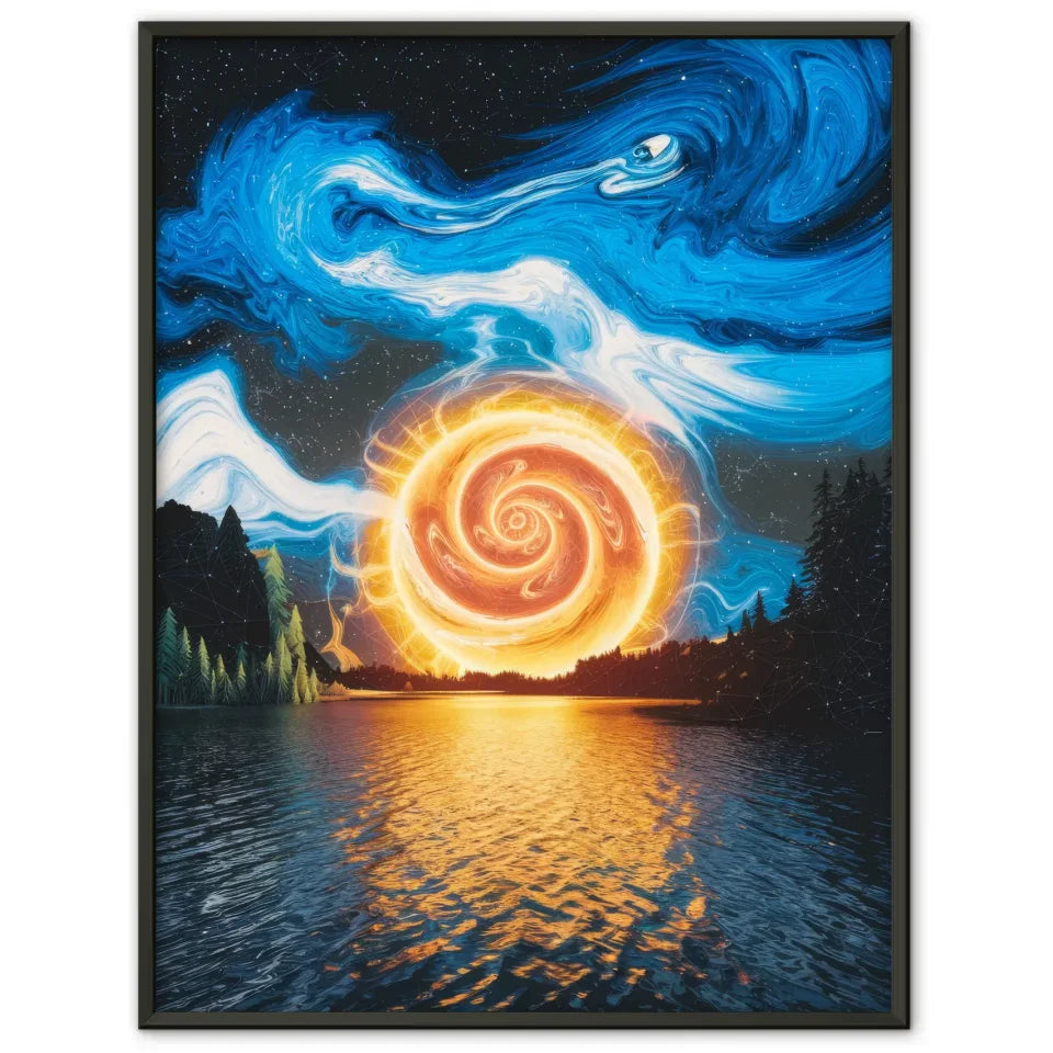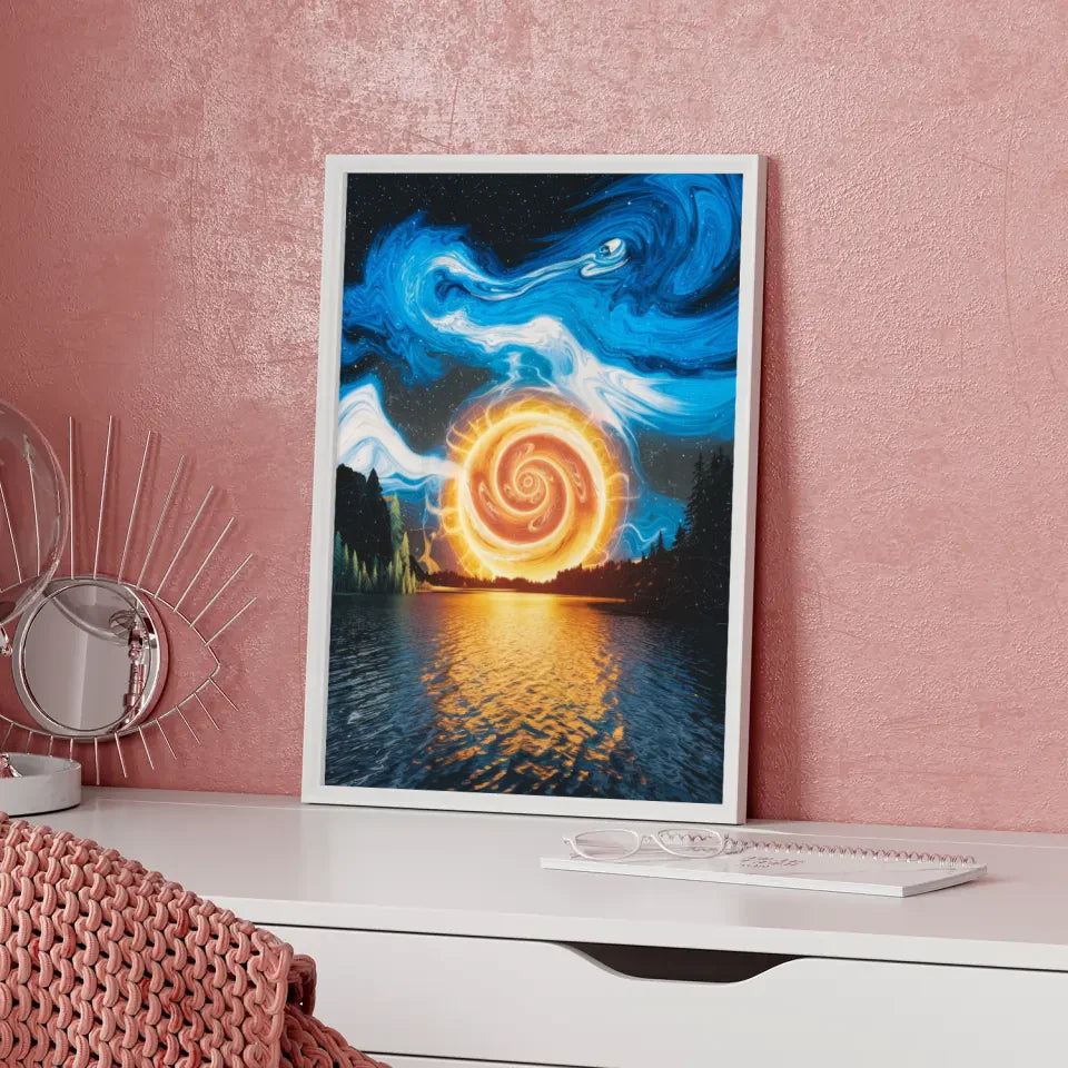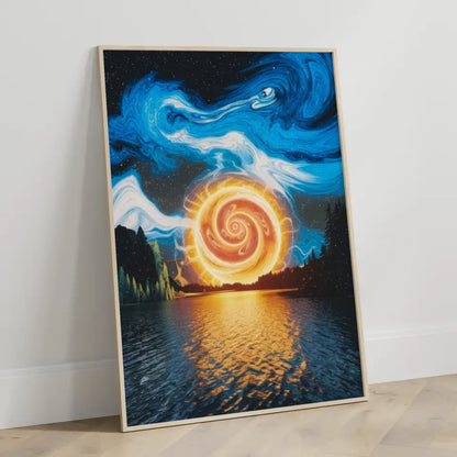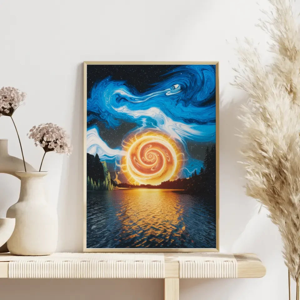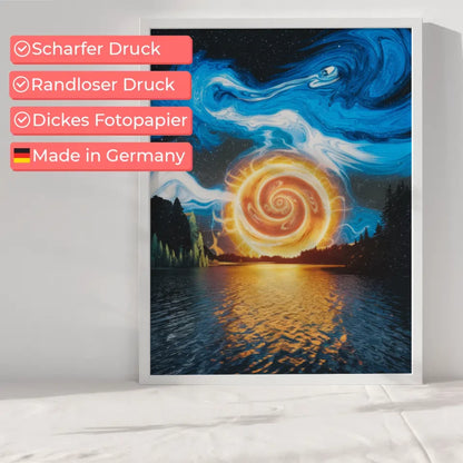 Entdecken Sie unser einzigartiges Poster mit Sonnenuntergang und Sternenhimmel Kunst, das Ihre Wände zum Strahlen bringt. Diese faszinierende, lebendige Illustration vereint einen von der Sternennacht inspirierten Himmel perfekt mit einem atemberaubenden Farbverlauf aus Blau-, Weiß-, Gelb- und Orangetönen. Das Poster zeigt eine ätherische, spiralförmige Sonne, die eine ruhige Seeszene beleuchtet und an den stilvollen Einfluss von Diego Rivera erinnert. Die meisterhafte Komposition verbindet Illustration, 3D-Stil-Rendering, Malerei und Konzeptkunst und schafft damit eine wirklich bezaubernde und lebendige Szene. Verleihen Sie Ihrem Wohnraum mit diesem kunstvollen Poster eine besondere Note und genießen Sie die perfekte Fusion aus Kunst und Natur.