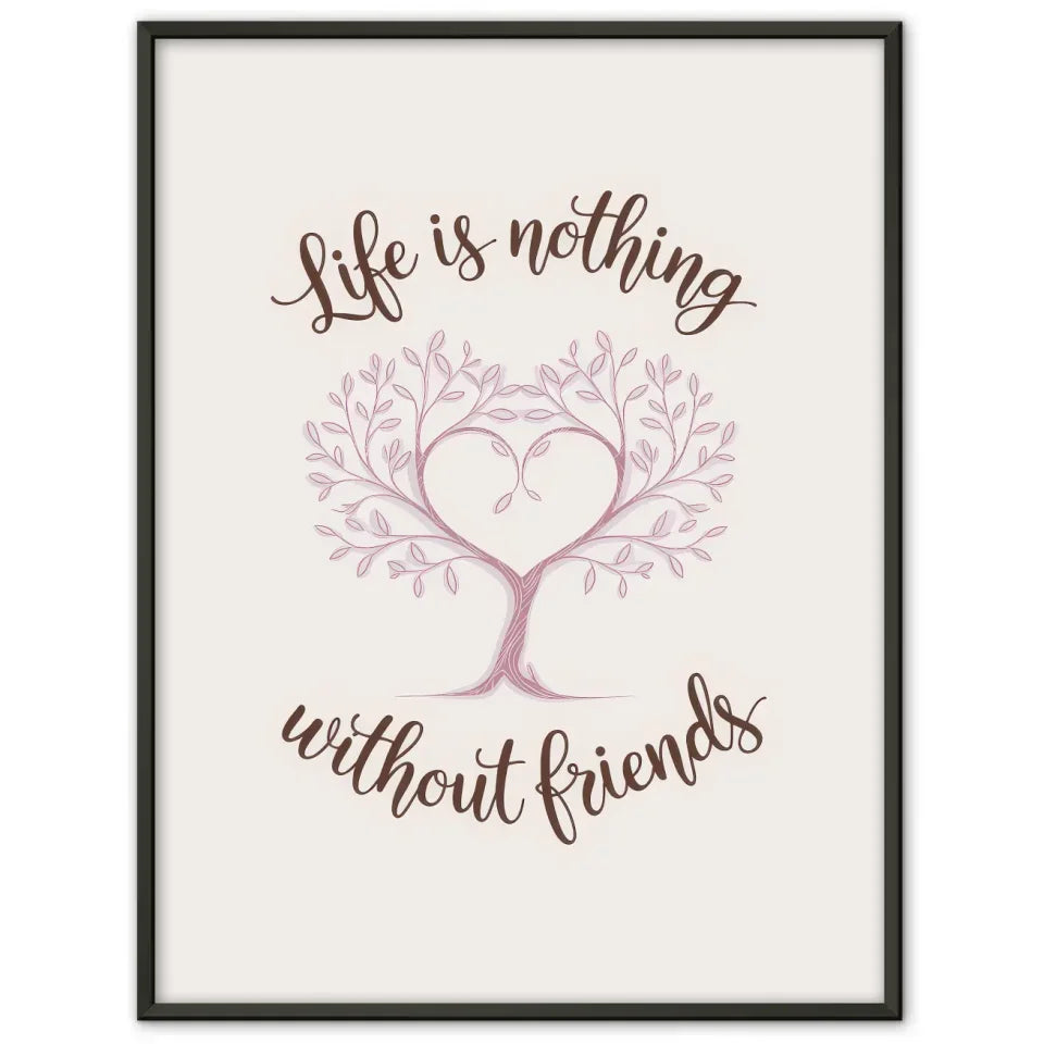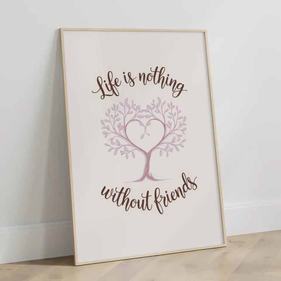 Das Poster trägt den inspirierenden Text 'LIFE IS NOTHING“ in schöner Handschrift über dem herzförmigen Baum und ergänzt diesen mit 'WITHOUT FRIENDS“ unterhalb der Illustration. Diese Kombination aus Bild und Schrift vermittelt eine warmherzige Botschaft, die Freunde und Familie gleichermaßen berührt. Dank der hochwertigen Druckqualität wird das Poster zum Blickfang in Ihrem Wohn- oder Arbeitsbereich und sorgt für eine angenehme Atmosphäre.