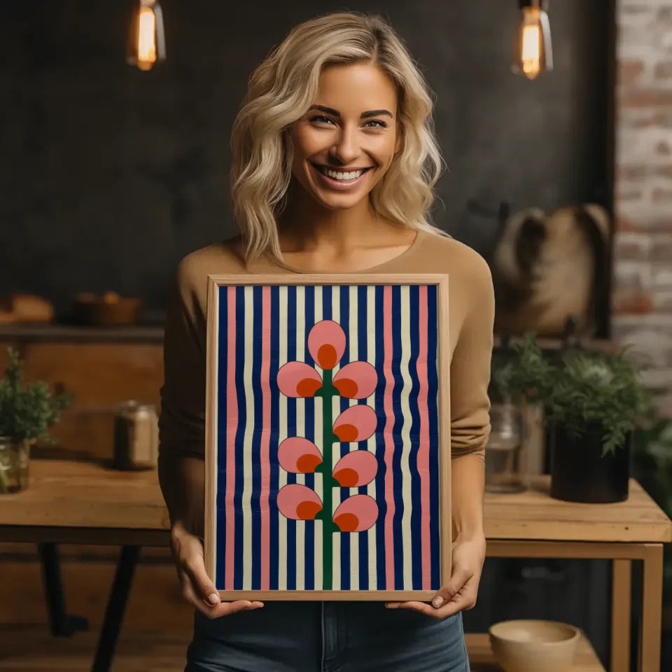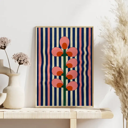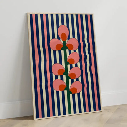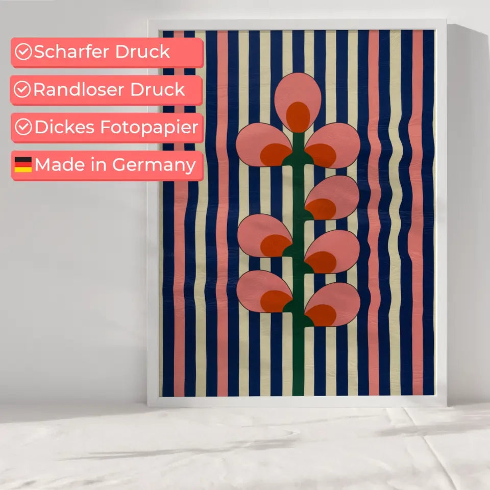 Der Hintergrund des Posters setzt in abwechselnd blauen und rosa Streifen, die handgemalt wirken und in ihrer Breite variieren, einen spannenden Akzent. Diese unregelmäßigen Streifen überschneiden sich gelegentlich mit den organischen Blütenblättern und erzeugen einen dynamischen, abstrahierten Effekt, der sofort ins Auge fällt. Die kontrastierenden Farben und klaren Formen des Posters strahlen eine moderne Frische aus, die jedes Ambiente aufwertet.