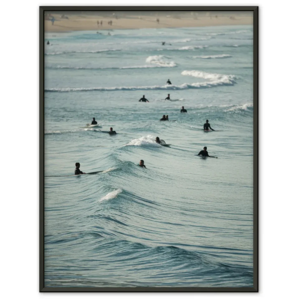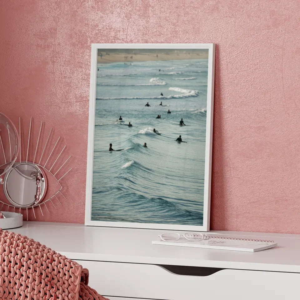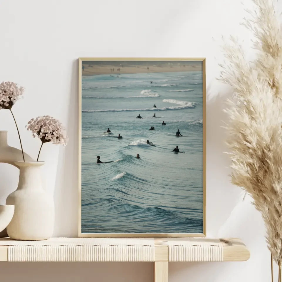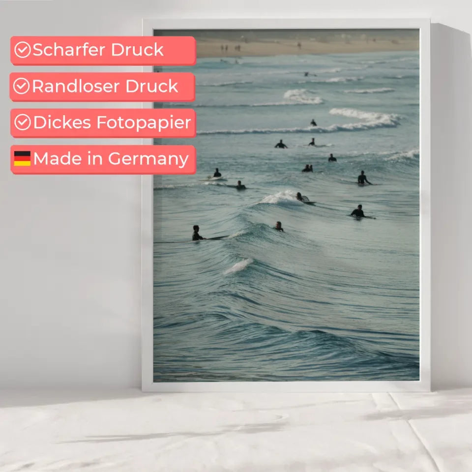 Verleihen Sie Ihrem Raum eine entspannte AtmosphĂ€re mit unserem stilvollen Poster. Dieses herausragende Poster zeigt eine ruhige Strandszene, die perfekt fĂŒr Strandliebhaber und Surf-Enthusiasten ist. Die Abbildung zeigt mehrere Surfer, die auf sanften, blauen Wellen reiten, und vermittelt das GefĂŒhl von Freiheit und Abenteuer. Jedes Detail des Posters ist darauf ausgelegt, die Schönheit und Gelassenheit eines sonnigen Tages am Strand einzufangen.