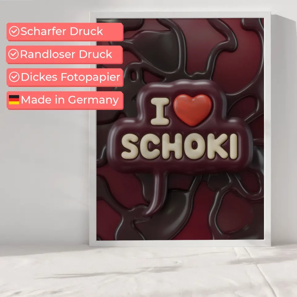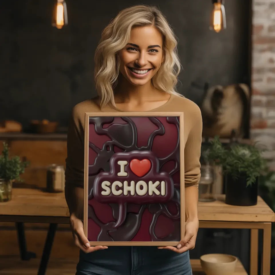 Entdecken Sie unser einzigartiges Poster mit verspieltem Design I Schoki in Creme und Dunkelrot, das in jeder Einrichtung Akzente setzt. Dieses bezaubernde Spruchbild kombiniert die süßen Worte 'I 🤍 Schoki“ in zarter Cremefarbe mit einem auffälligen, dunkelroten Hintergrund, der durch flüssige Wirbel besticht. Das Poster besticht nicht nur durch seine Ästhetik, sondern auch durch seine spezielle Haptik: Die Wörter scheinen in eine weiche, matschige Oberfläche eingebettet zu sein, die die Sinne anspricht.
